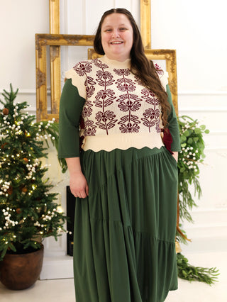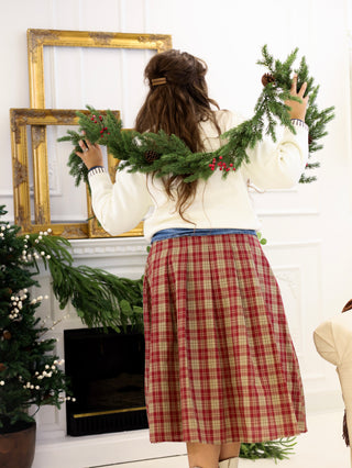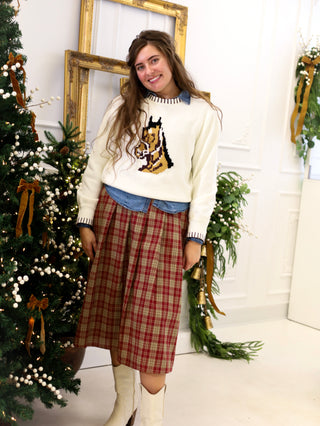 Pair our cream horse motif sweater with our vintage plaid pleated skirt for the perfect holiday outfit!