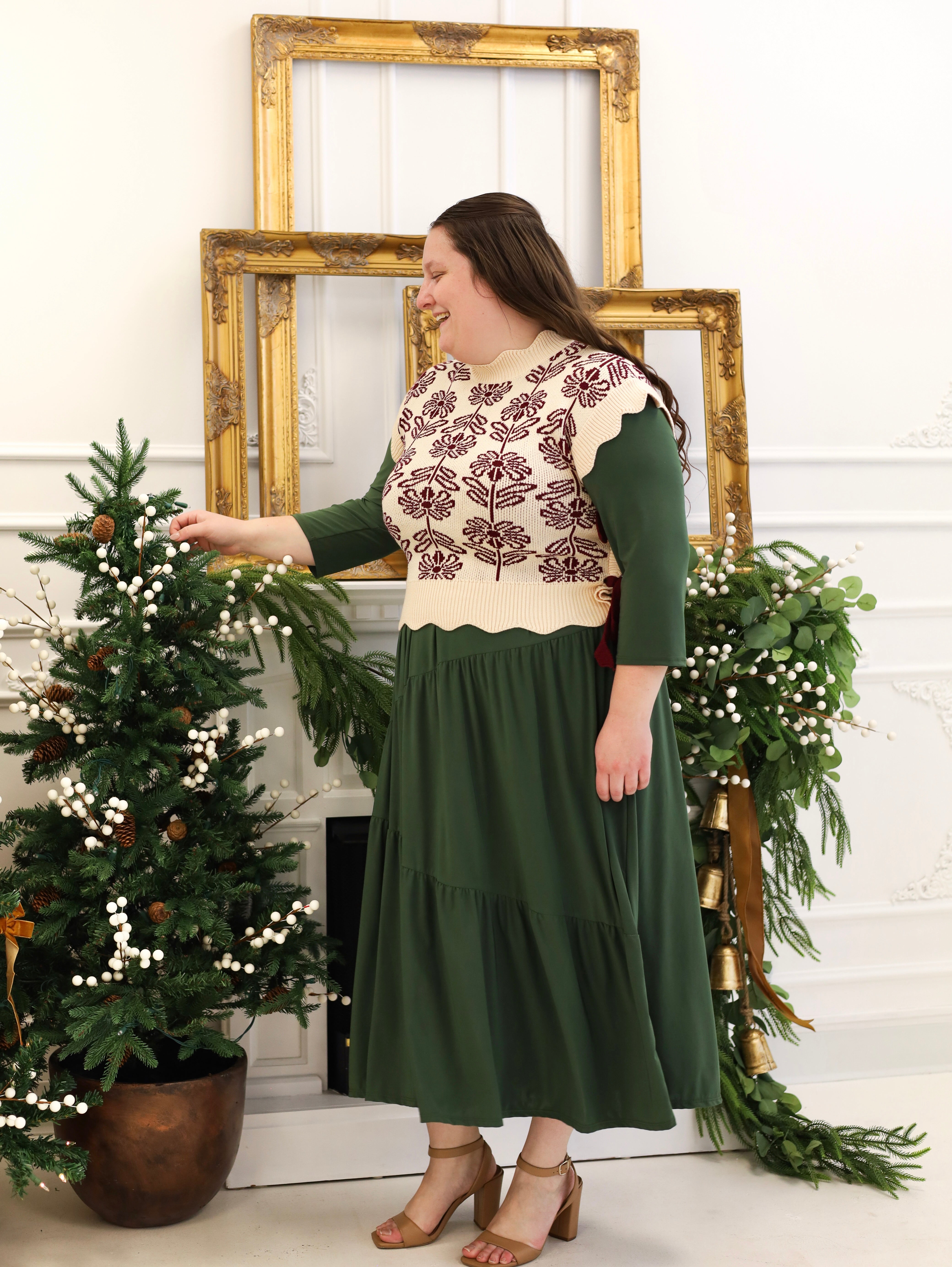 Layer up with effortless charm in this floral sweater vest! Featuring a ribbed scalloped mock neck and matching hem details, it's designed for a polished look. The eye-catching floral knit pattern brings personality to any outfit, while contrast side ties let you cinch the fit to perfection. Pair it over a crisp white tee or cozy long-sleeve for endless styling possibilities. A playful piece that proves sweater vests are anything but boring.