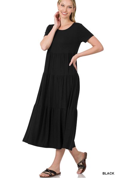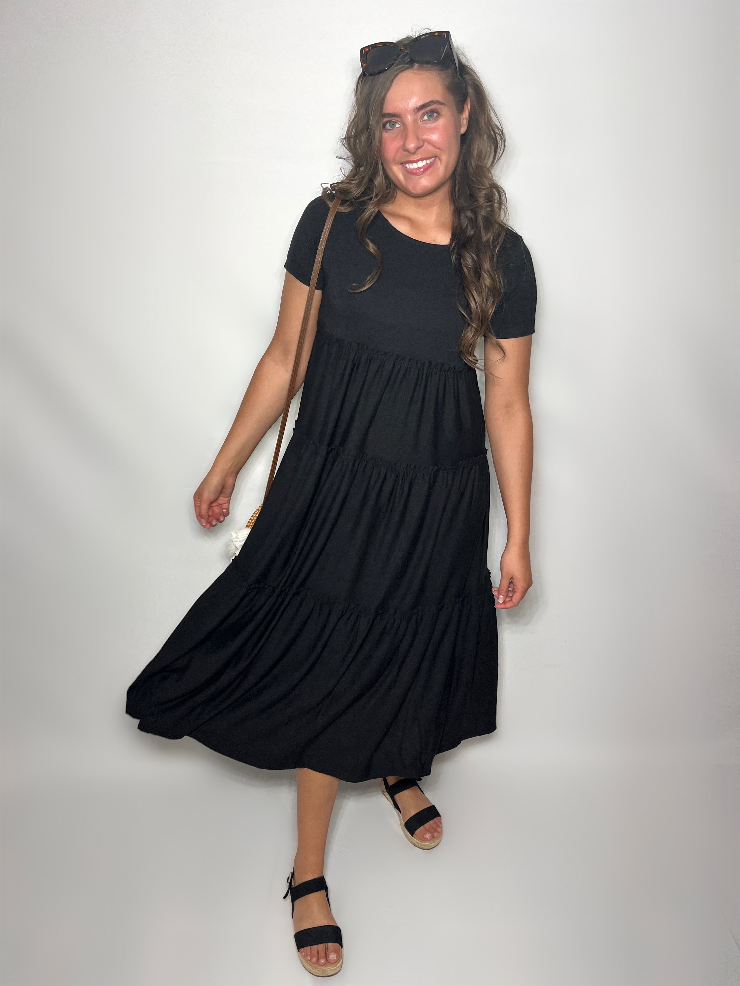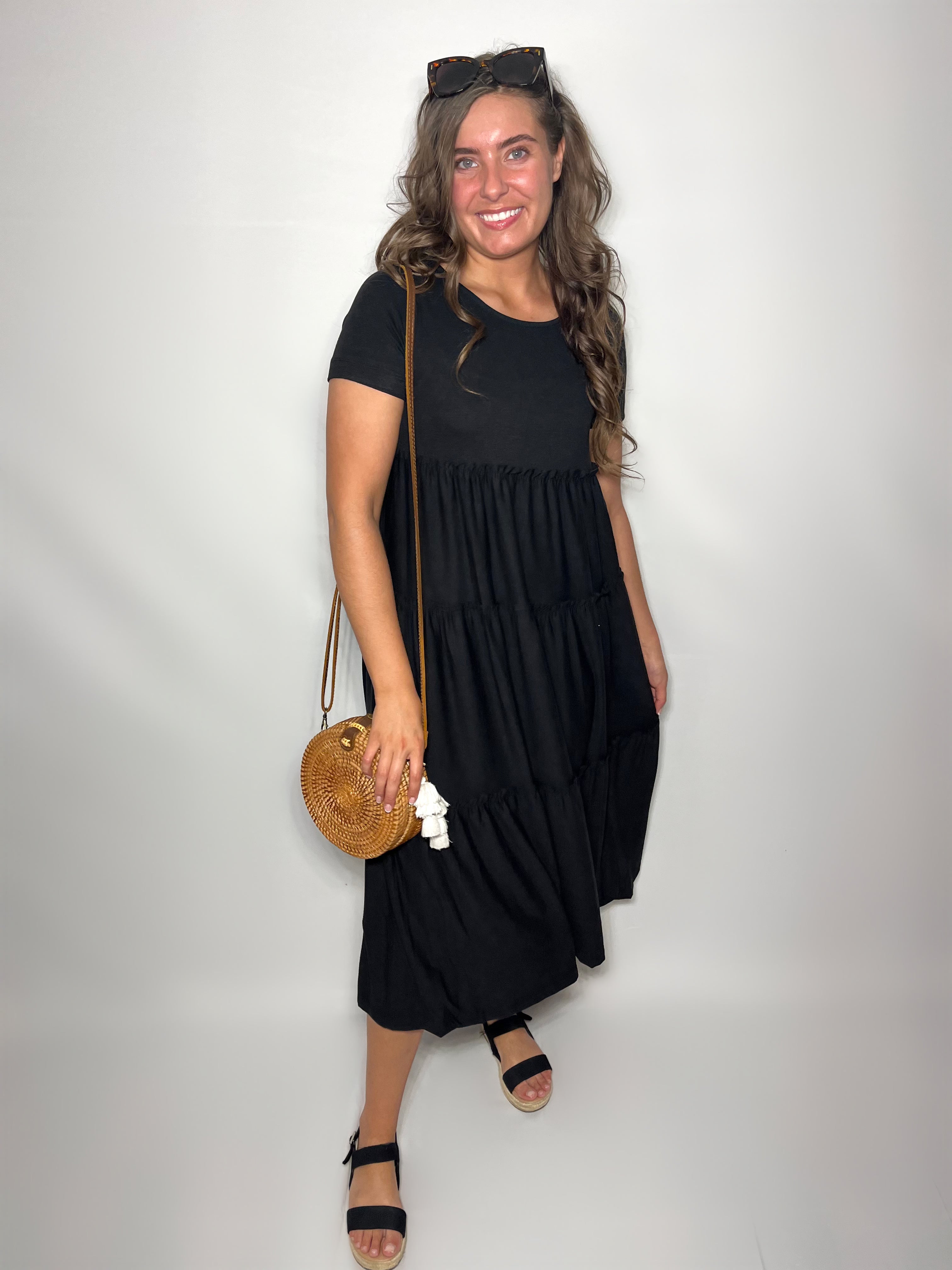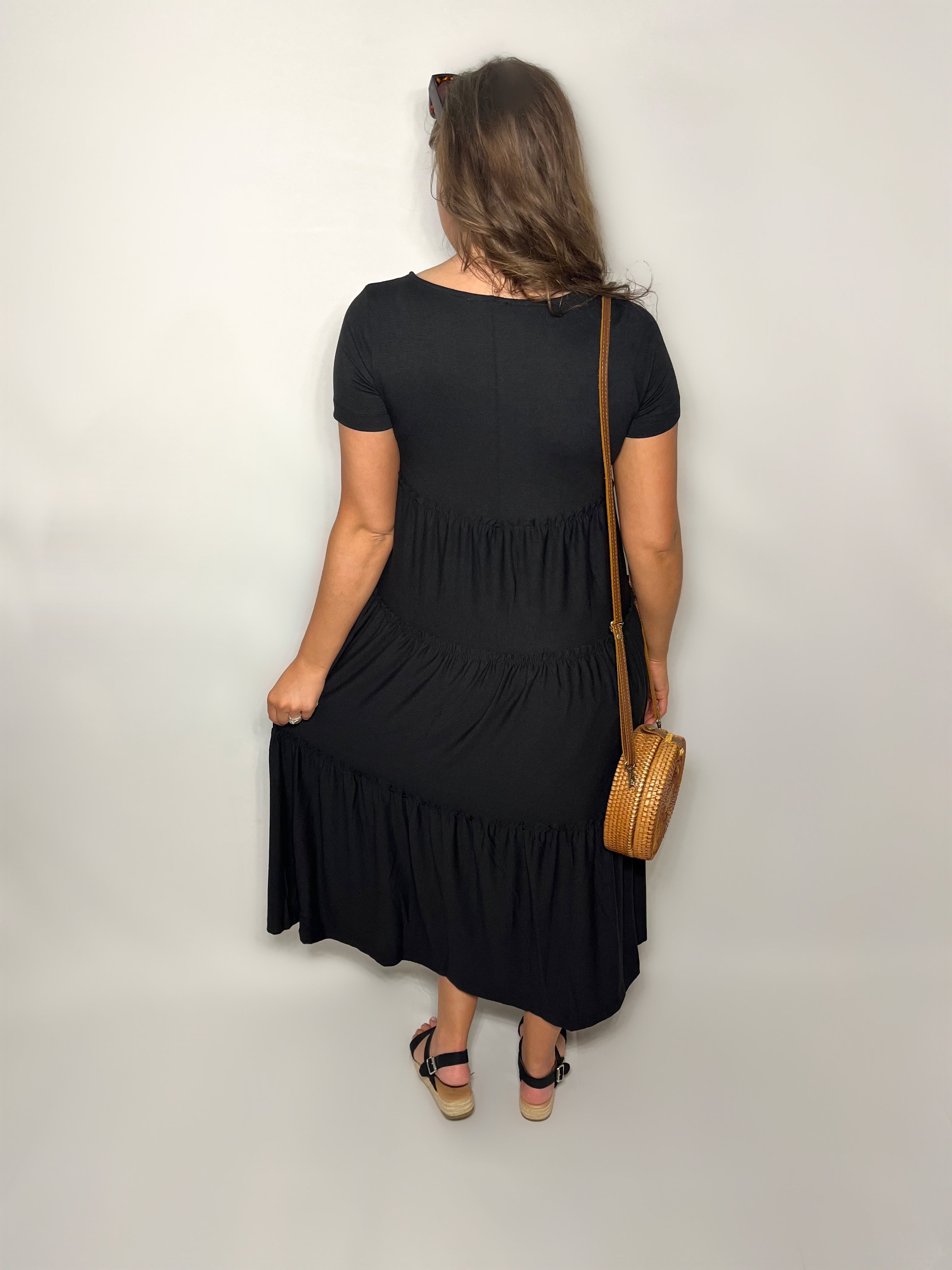 Our essential black maxi dress has a cute tiered skirt and is made of soft, stretchy material. This dress is great for layering with jackets or sweater or for wearing all alone. It can easily be styled for both dressy and casual occasions. It is also the perfect traveling dress since it is comfortable and does not wrinkle.