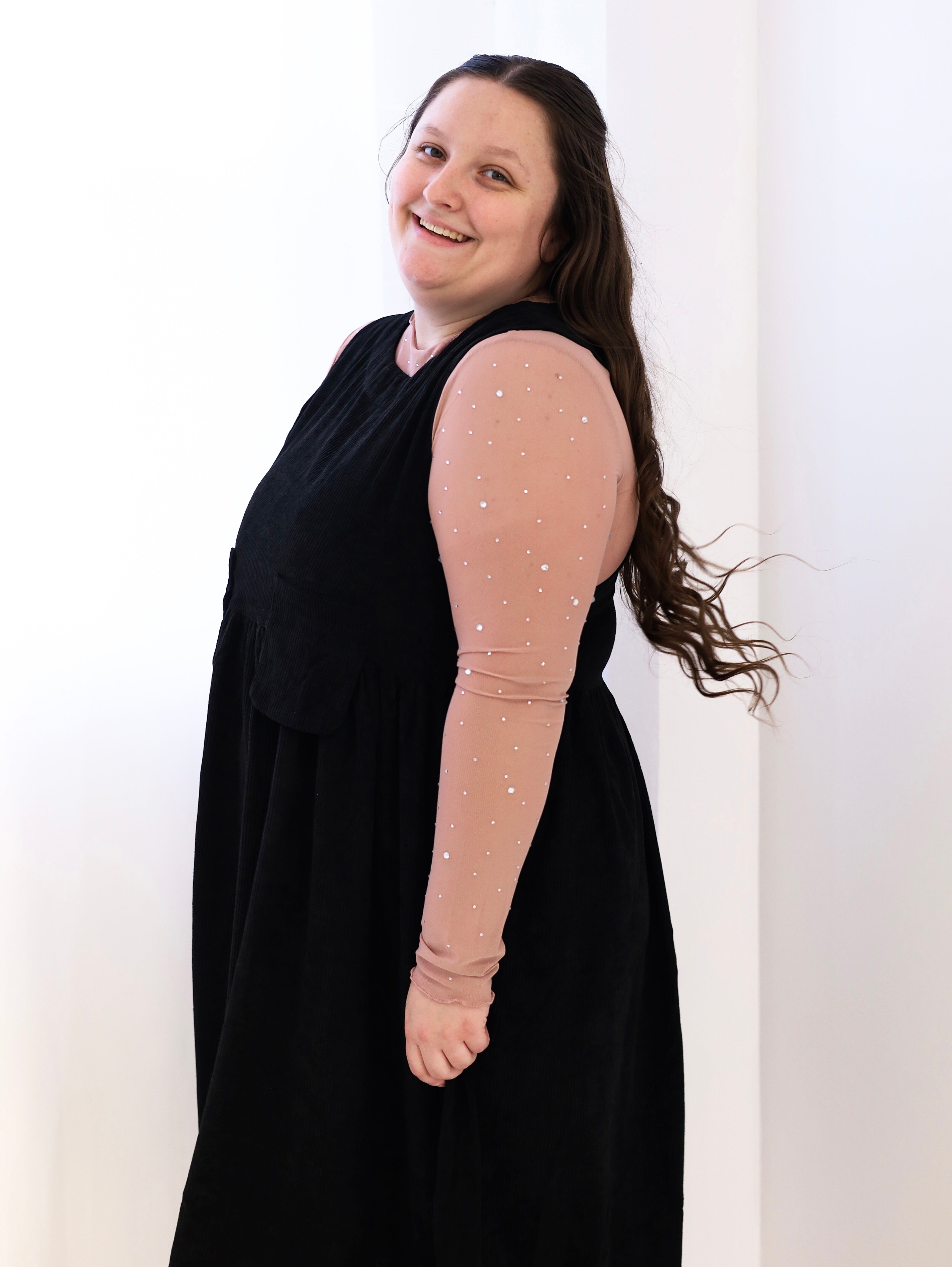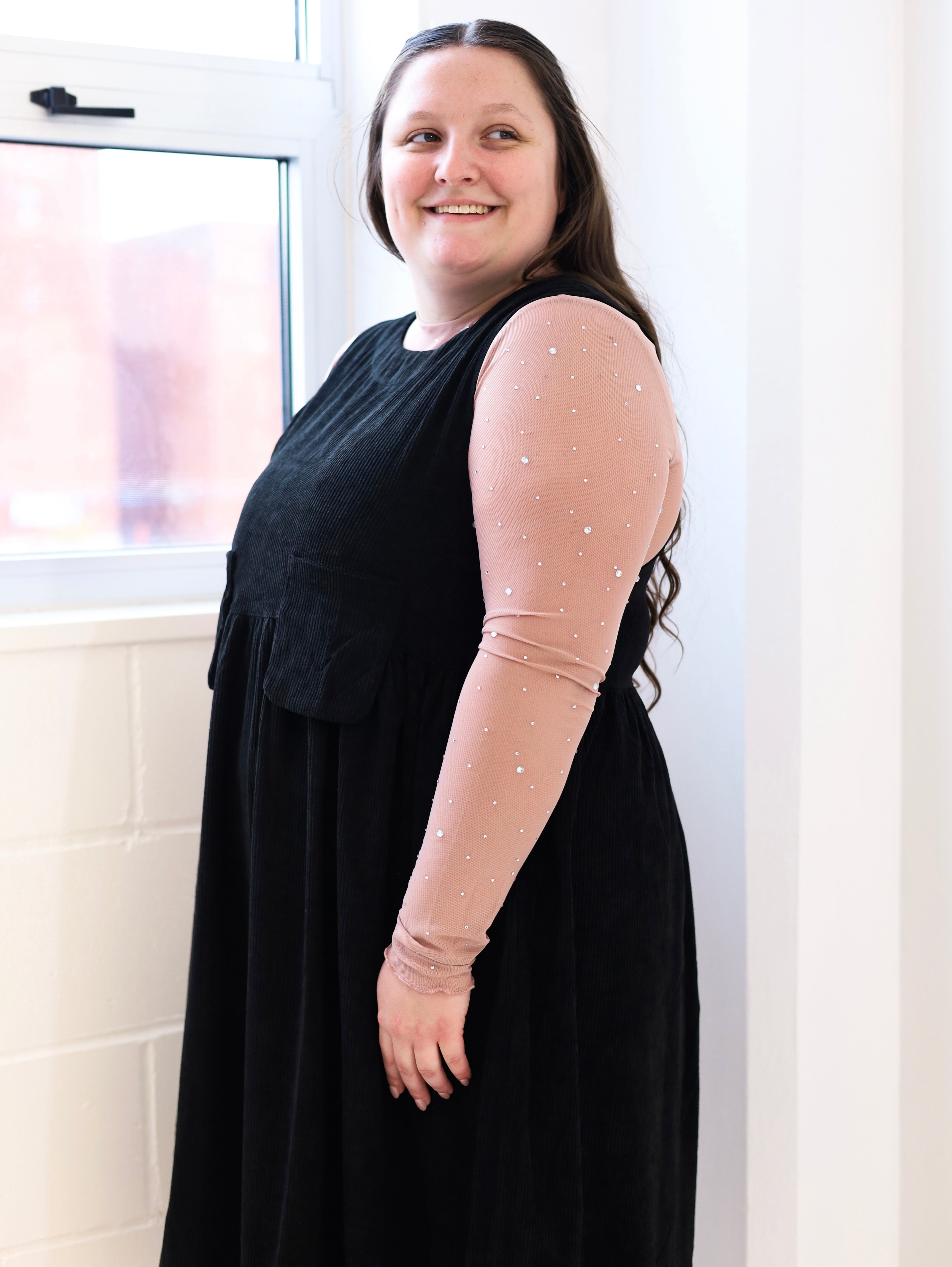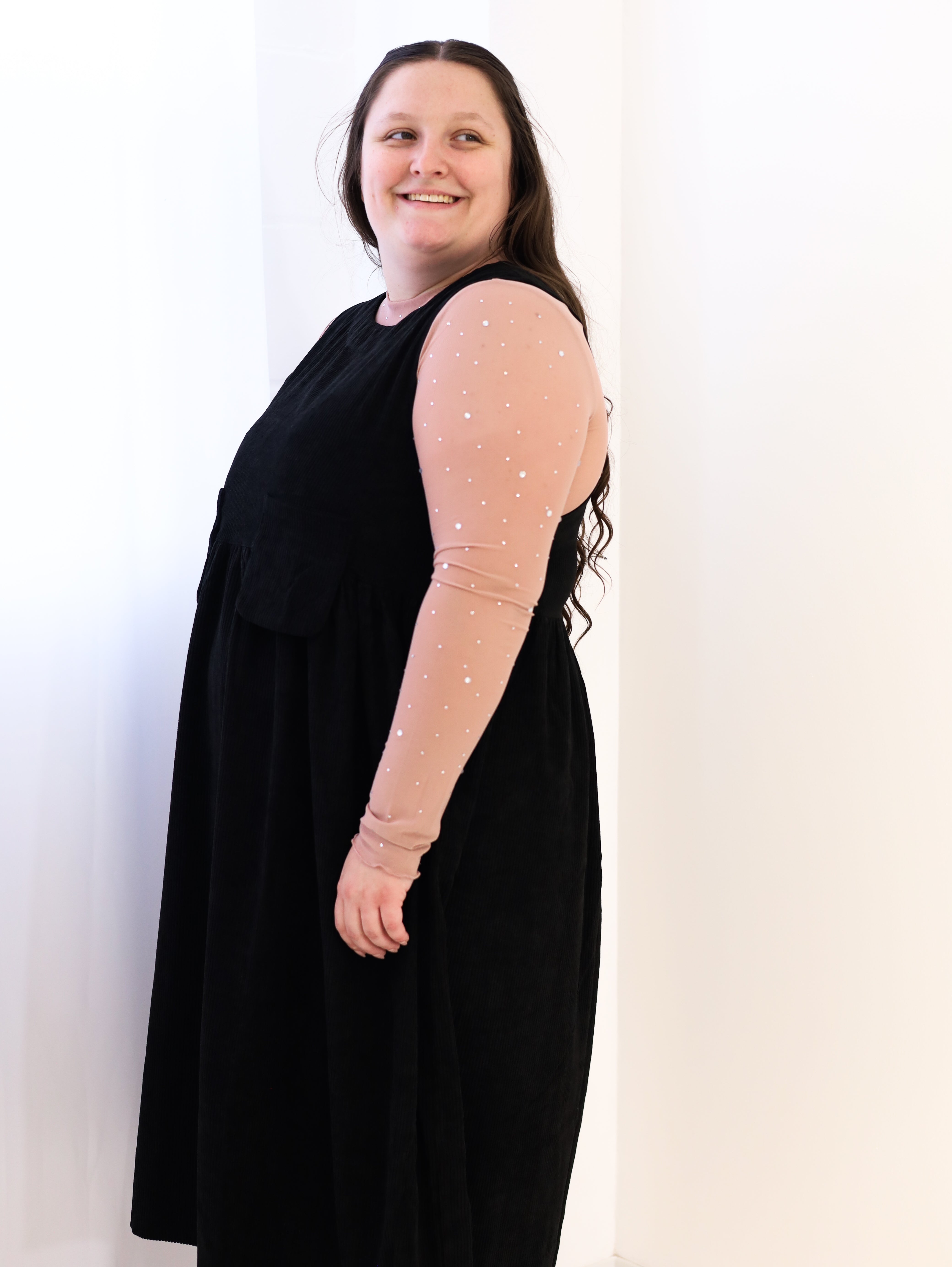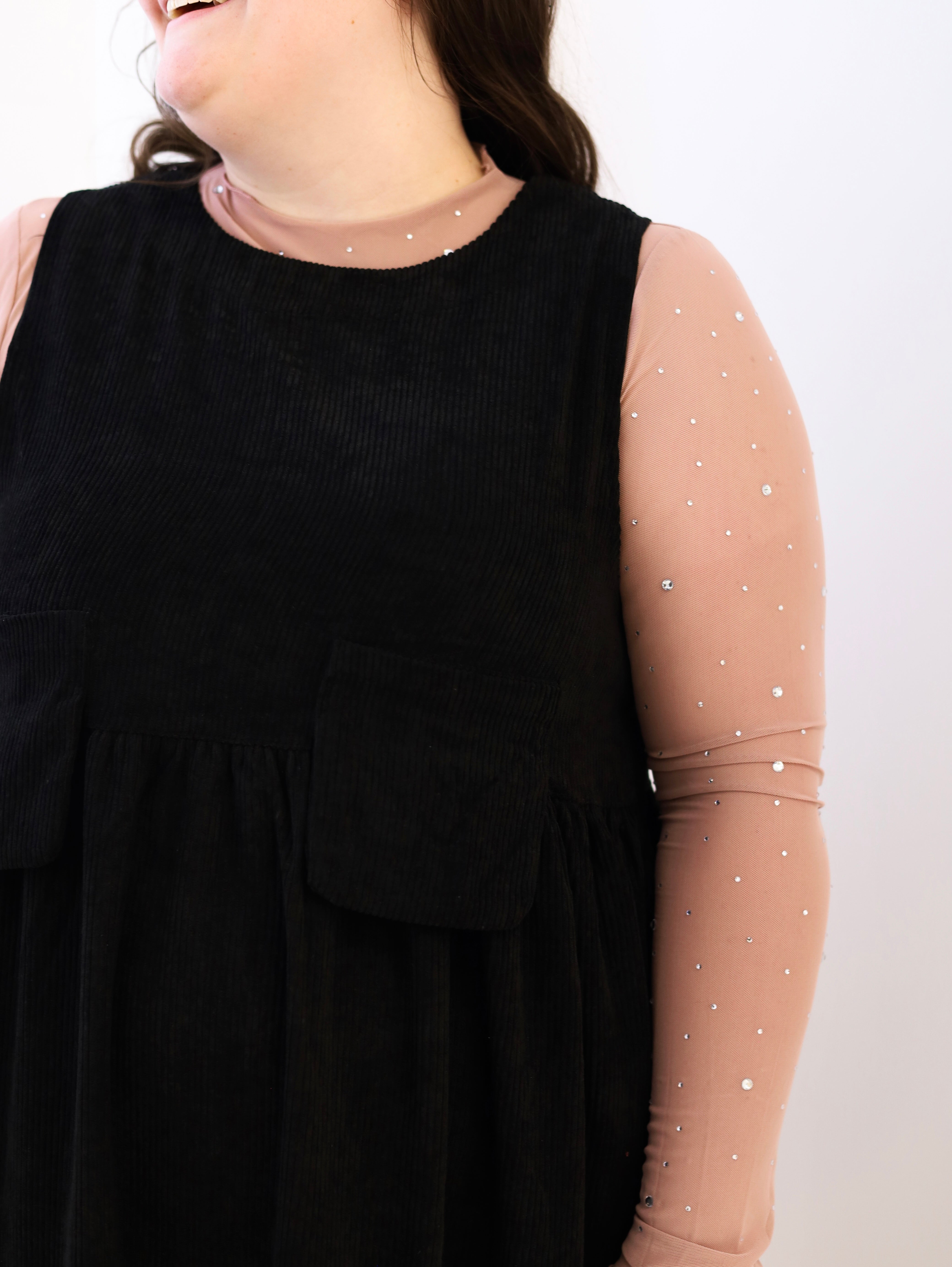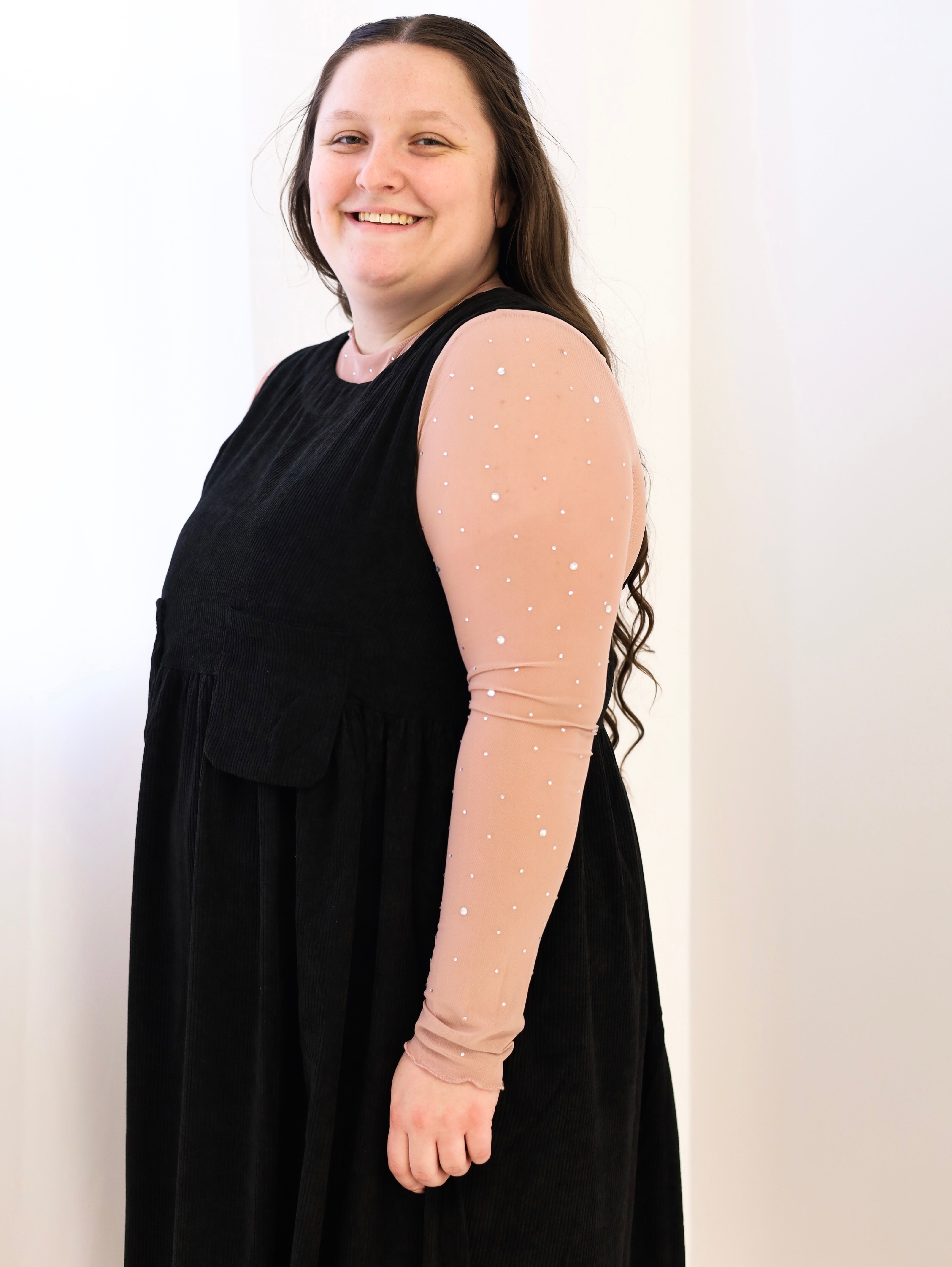 Elevate your layering game with this show-stopping Taupe mesh layering top adorned with shimmering rhinestone trim along the sleeves. The long sleeves provide coverage while the delicate mesh fabric keeps things light and breathable. Perfect for layering under your favorite basics and dresses to keep things modest. Whether you're heading out for a date night or adding sparkle to your everyday look, this versatile piece delivers major style points without the fuss.