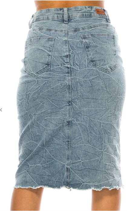 The Twyla Distressed Denim Skirt from Be-Girl offers a modern take on classic denim with a stretch fabric that ensures comfort and shape retention. This middle-length pencil skirt features a tied wash finish and a basic five-pocket design, providing both style and practicality. Its clean silhouette without a slit makes it versatile for various occasions, balancing edge and sophistication with expert craftsmanship.