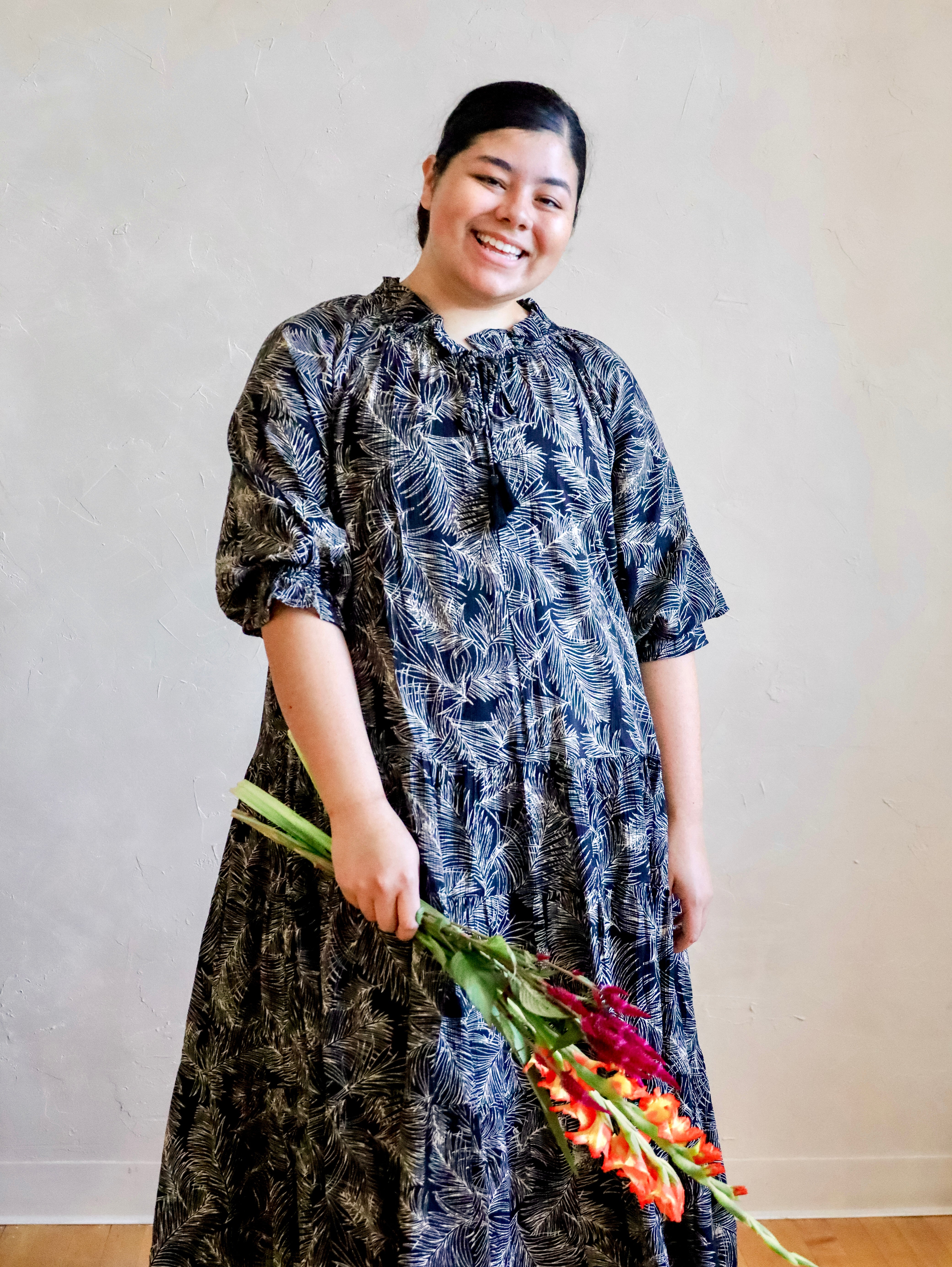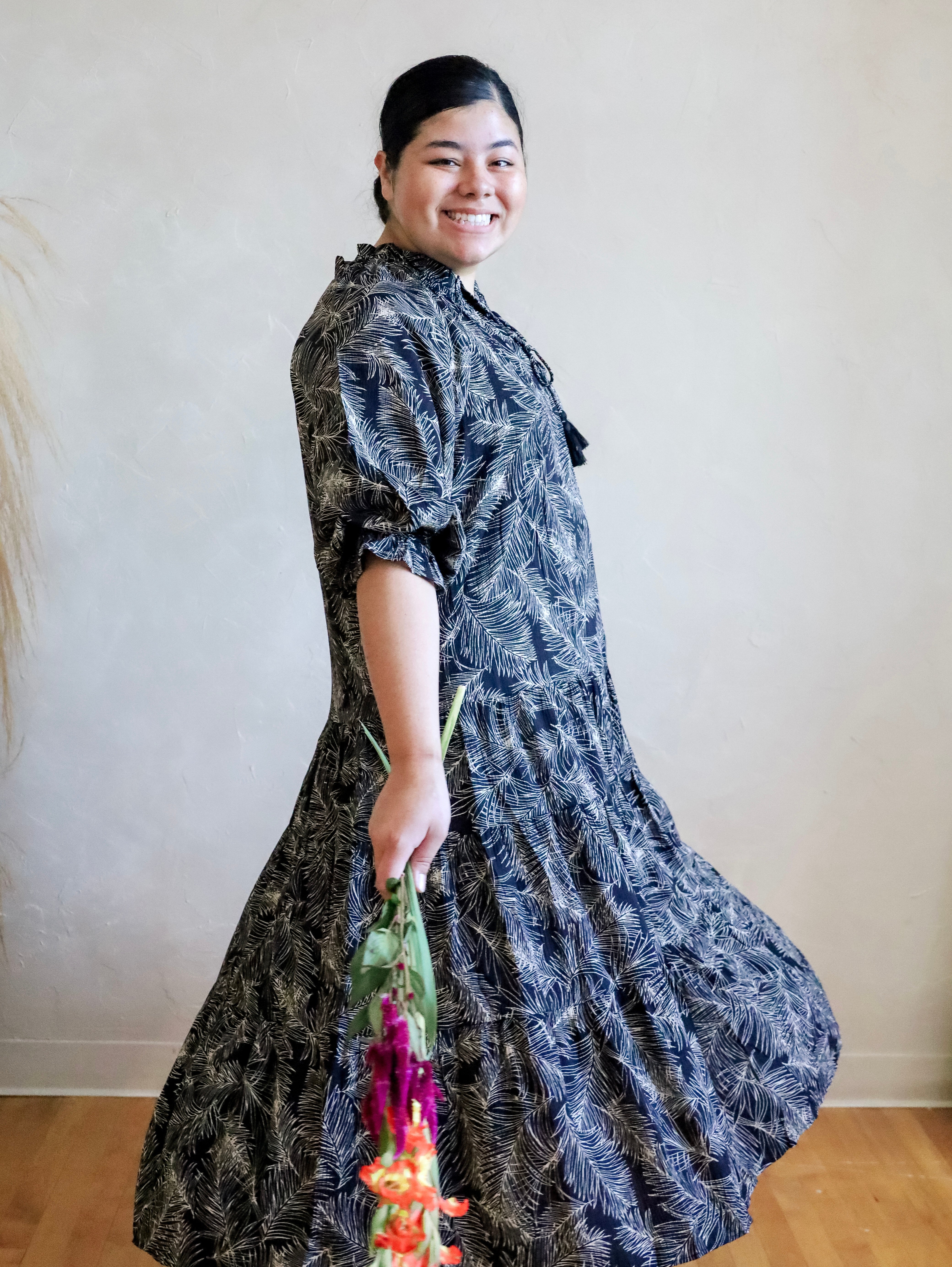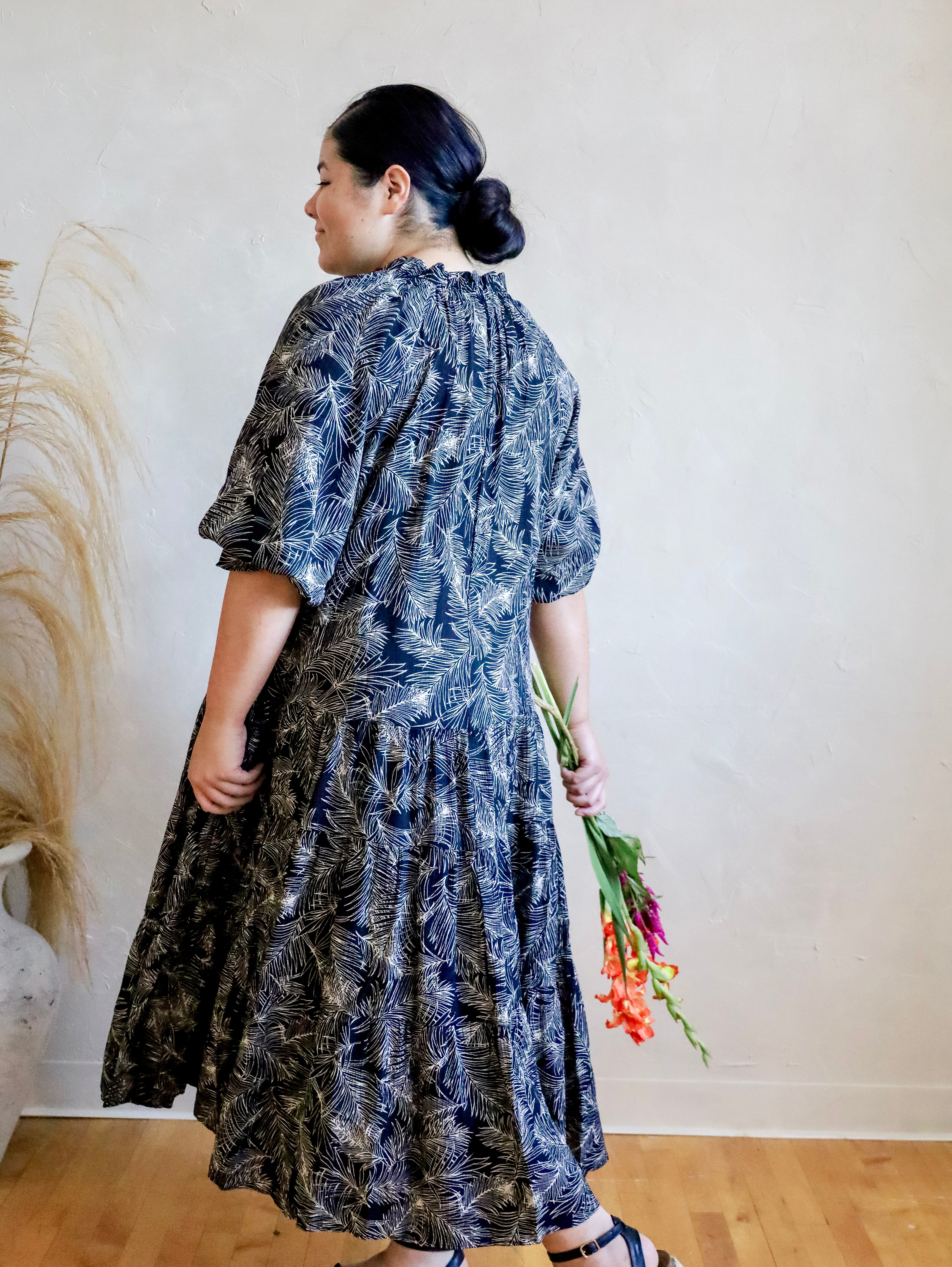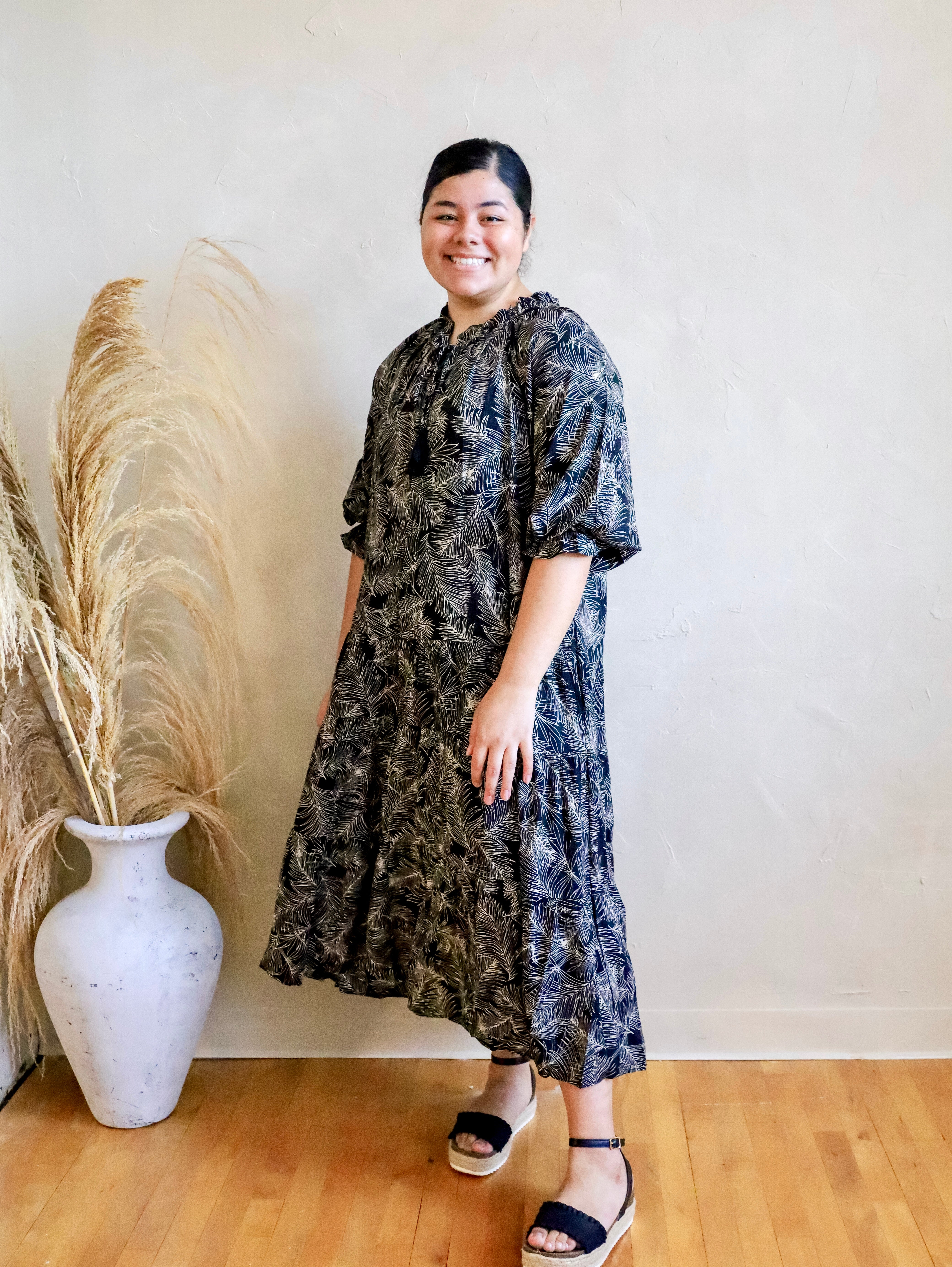 Description: Expertly crafted with soft and breathable leaf print cotton poplin, this Black and White Maxi Dress features a flattering ruffle design for a stylish and comfortable fit. Perfect for any occasion, this dress offers the perfect blend of fashion and functionality.