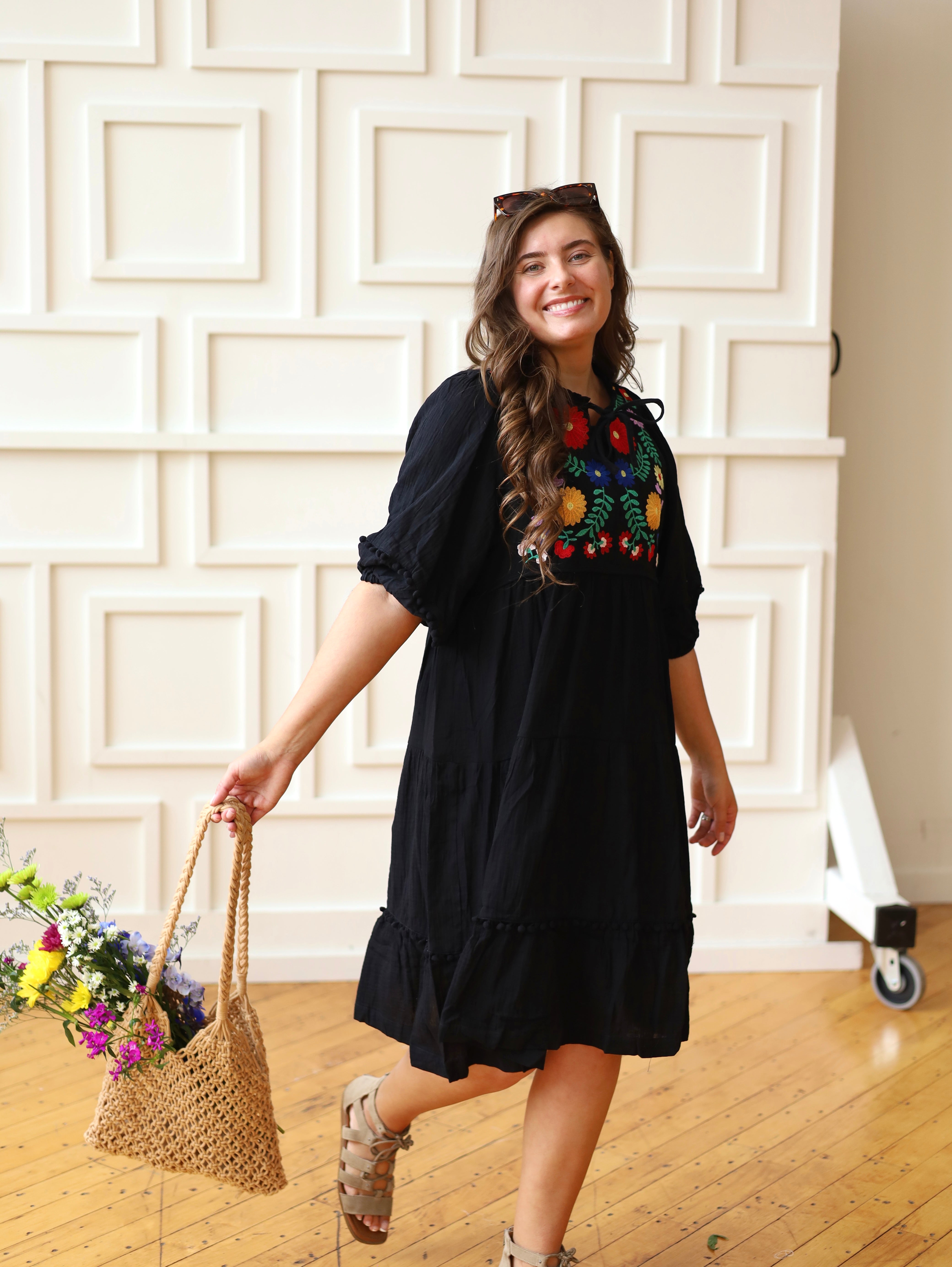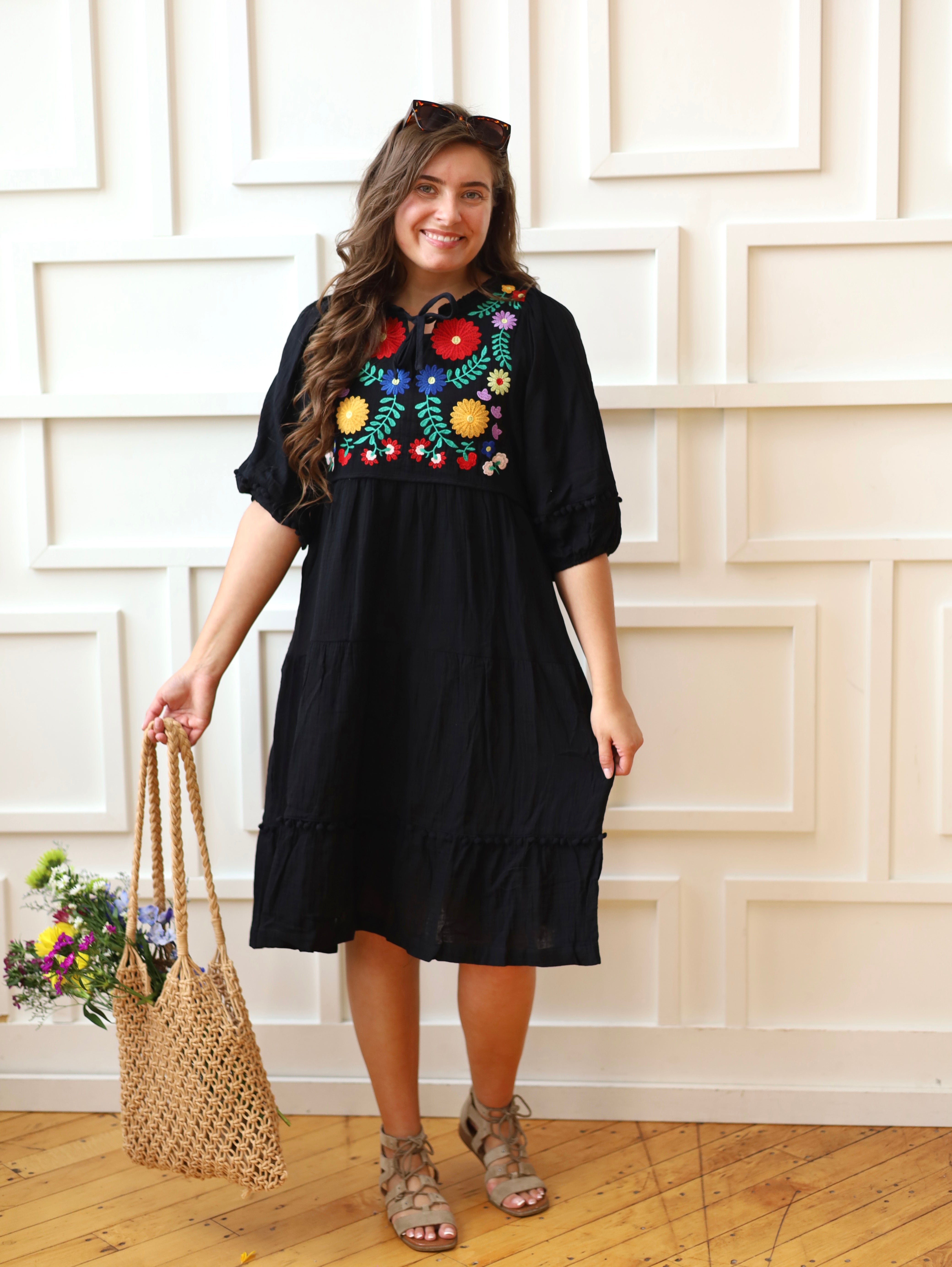 This Black Floral Embroidered Vacation Midi Dress brings a playful charm to your wardrobe with its delicate cotton gauze fabric and intricate floral embroidery. The tiered design adds a some bounce, while the whimsical pom pom details give it a fun, carefree vibe—perfect for sunny getaways or casual strolls. Lightweight and breezy, it keeps you comfortable and stylish wherever your adventures take you.