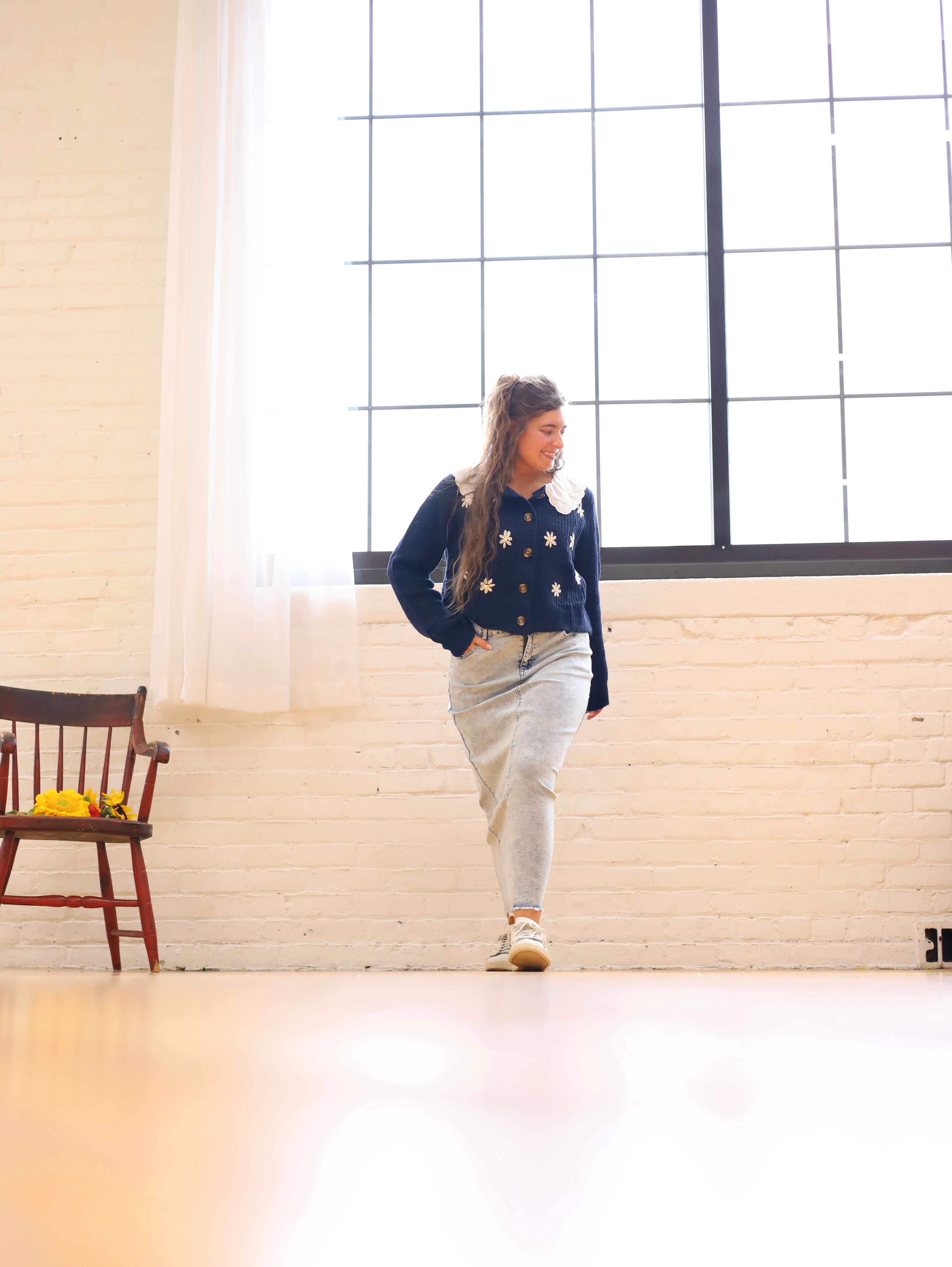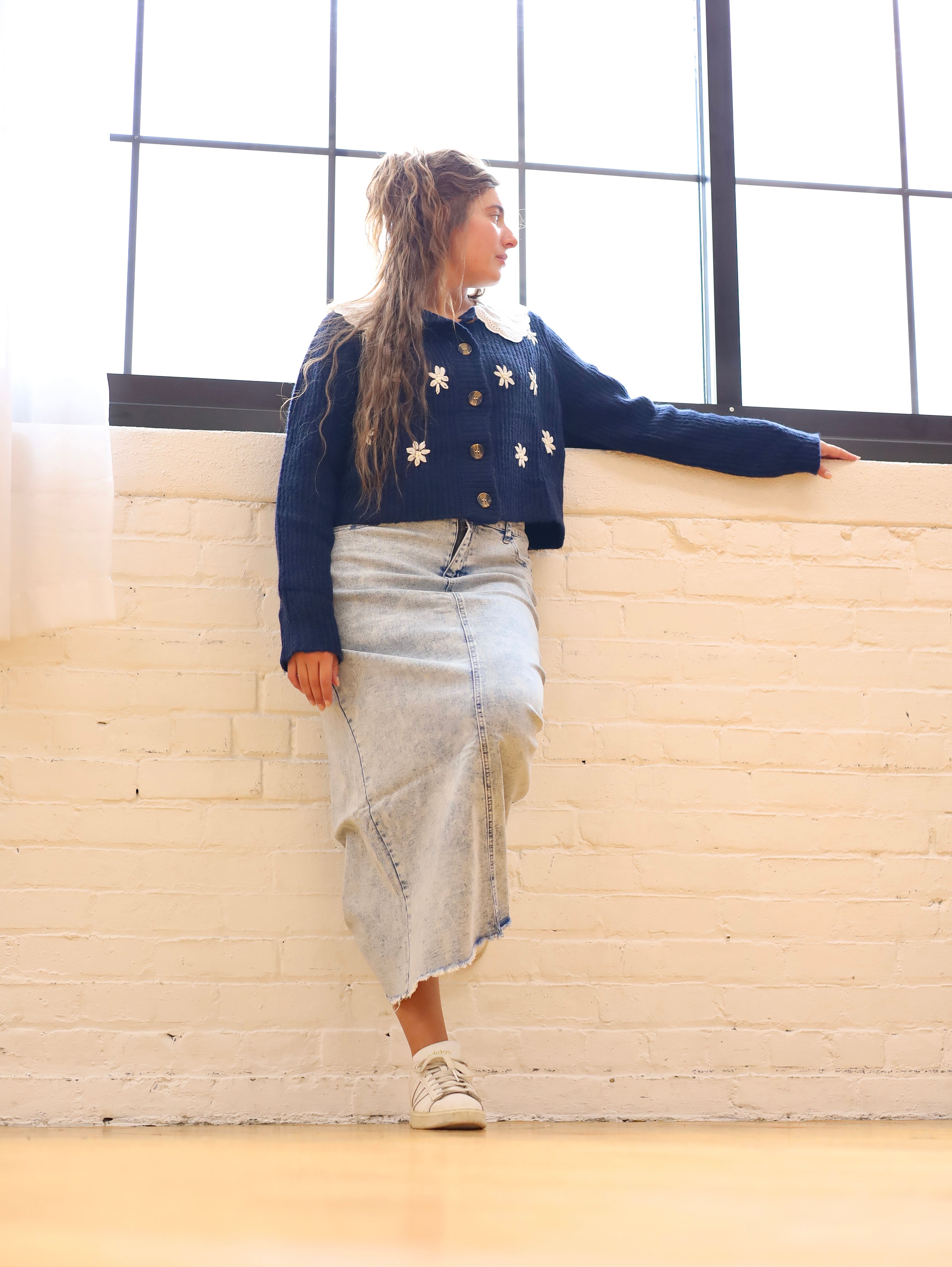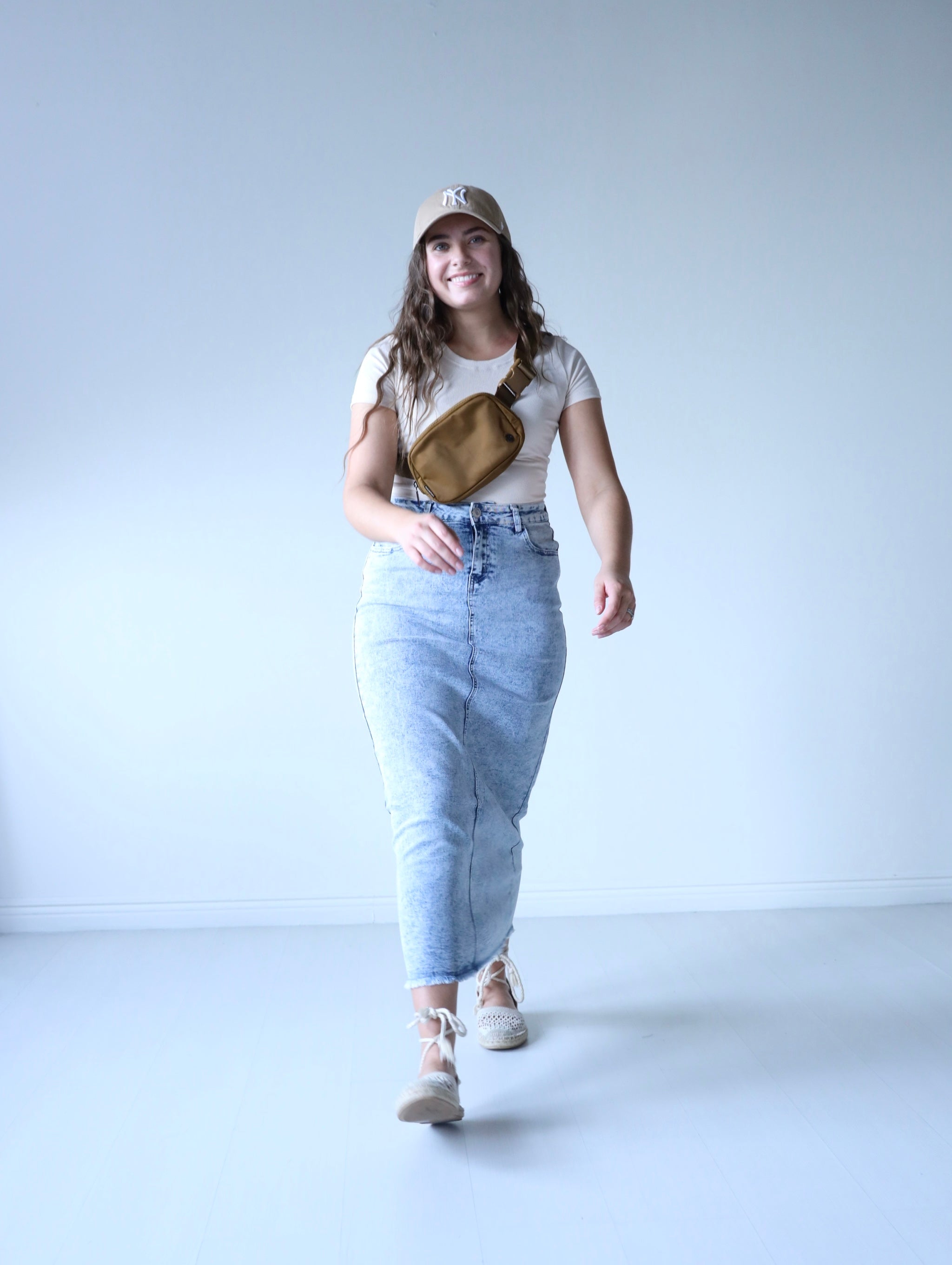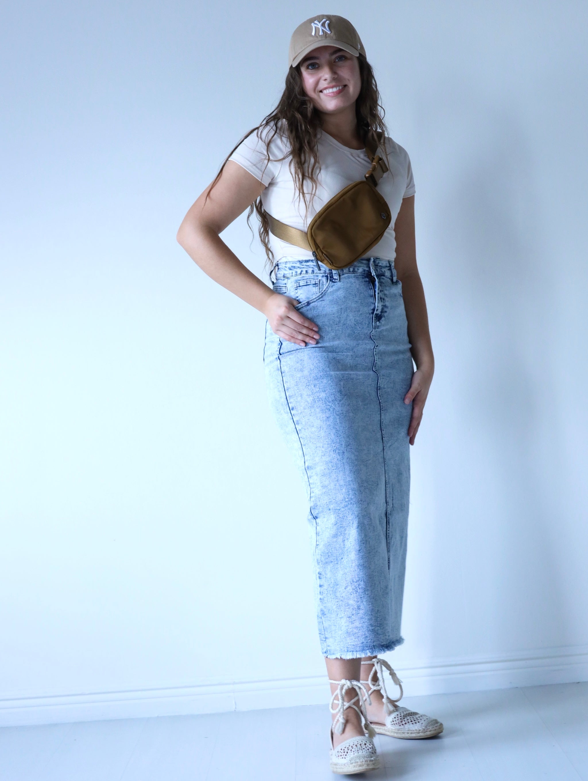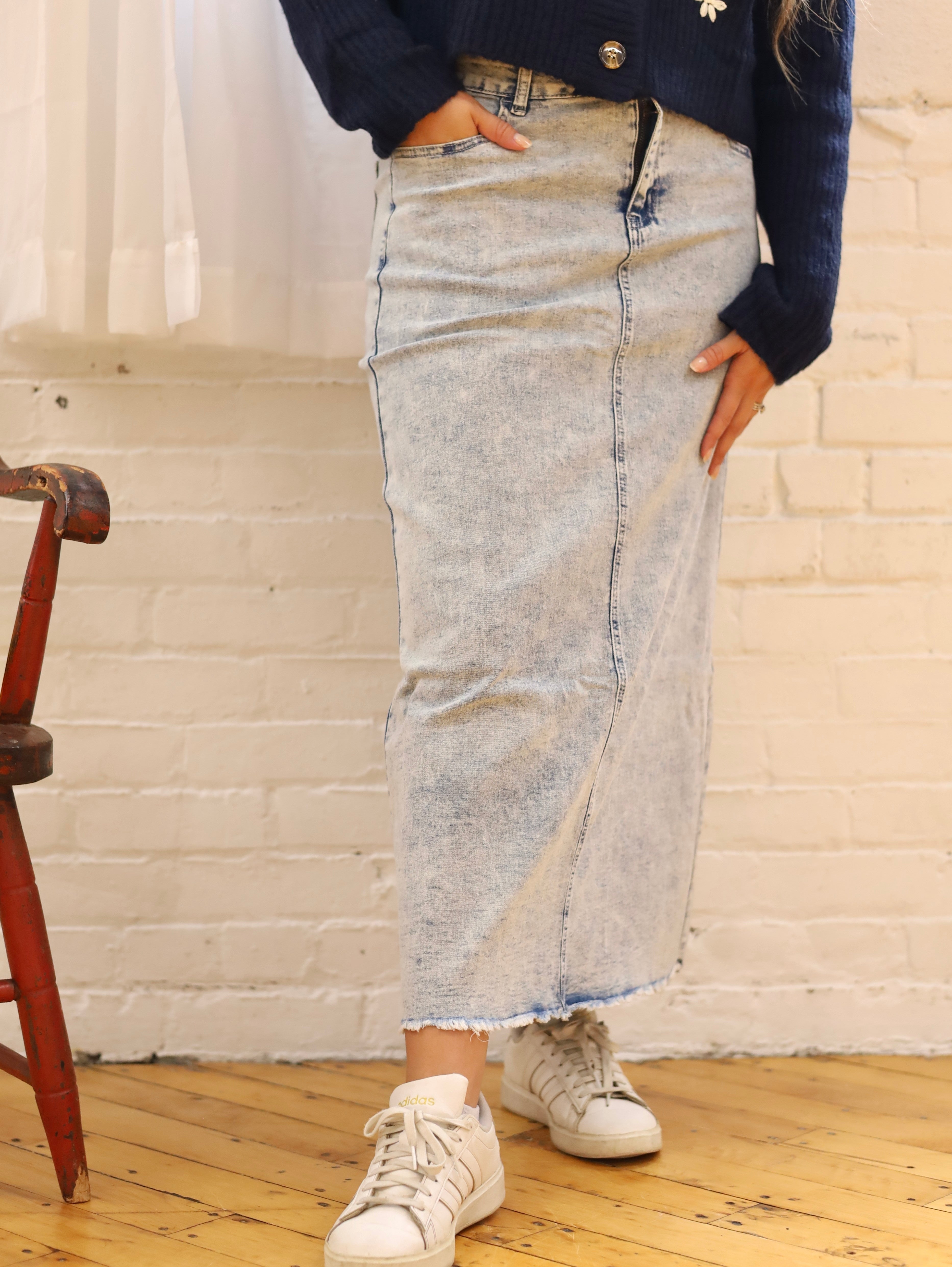 Introducing the Light Acid Wash Maxi Denim Skirt from the Be-Girl Brand. This versatile skirt features stretch denim for comfort and a frayed bottom for a stylish touch. With 5 pockets, it's both functional and trendy. Perfect for any occasion, this long skirt is a must-have in your wardrobe.