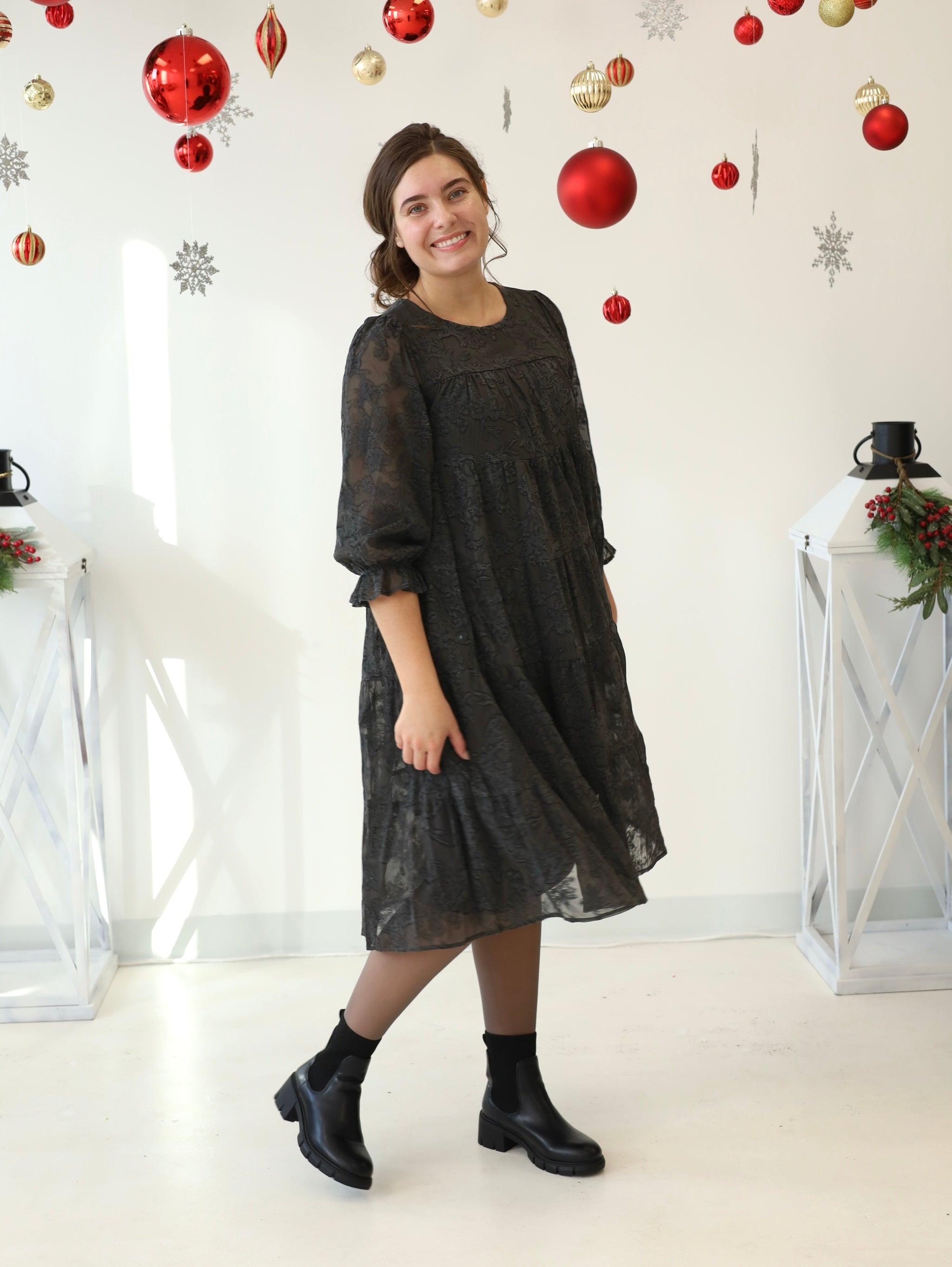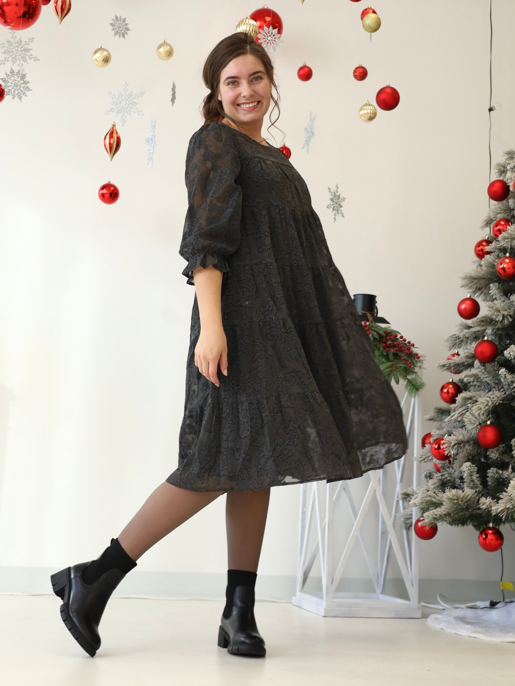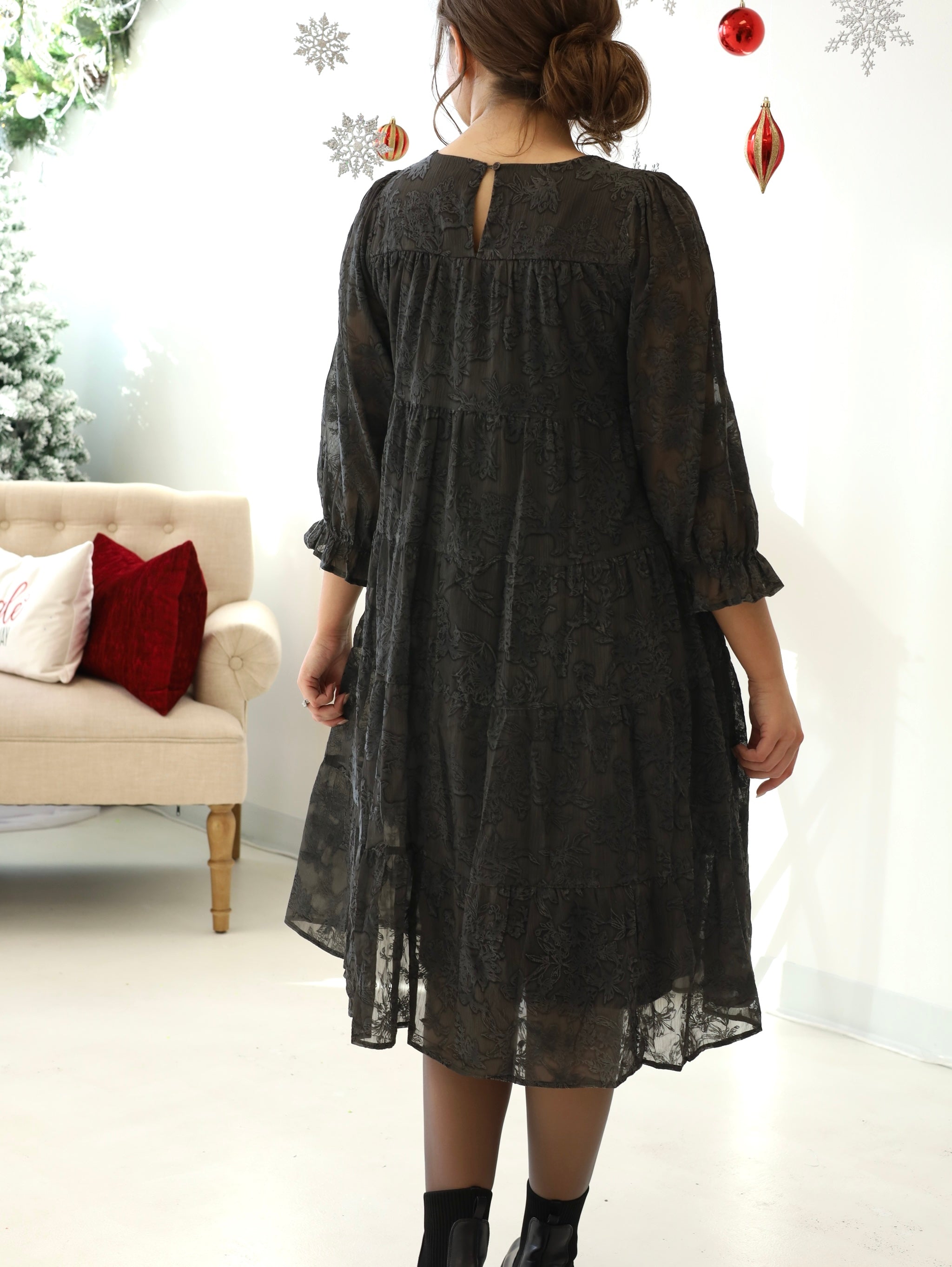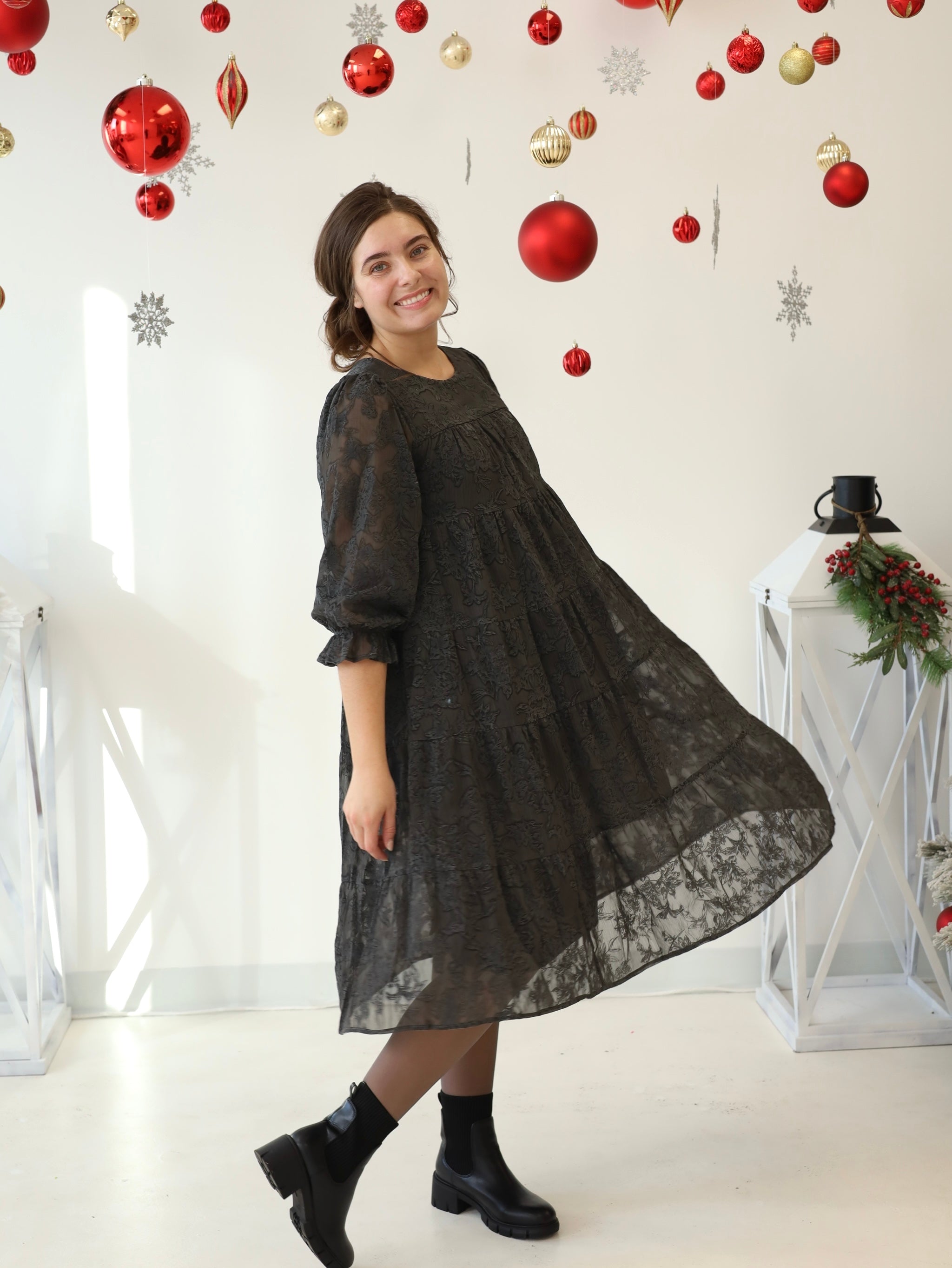 Expertly designed with a round neck and long sleeves, this silver midi dress exudes elegance and sophistication. The full lining provides comfort and the velvet floral appliques add a touch of luxury. The tiered skirt adds dimension to this stunning dress. Perfect for any special occasion.