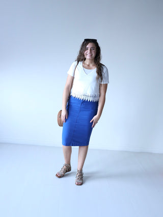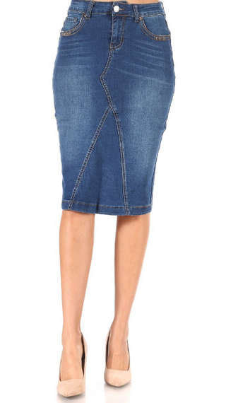 We offer classy and on trend modest midi skirts. These modest skirts complete any fashionable apostolic wardrobe and are available in neutral and fun colors as well as modest denim midi skirts.