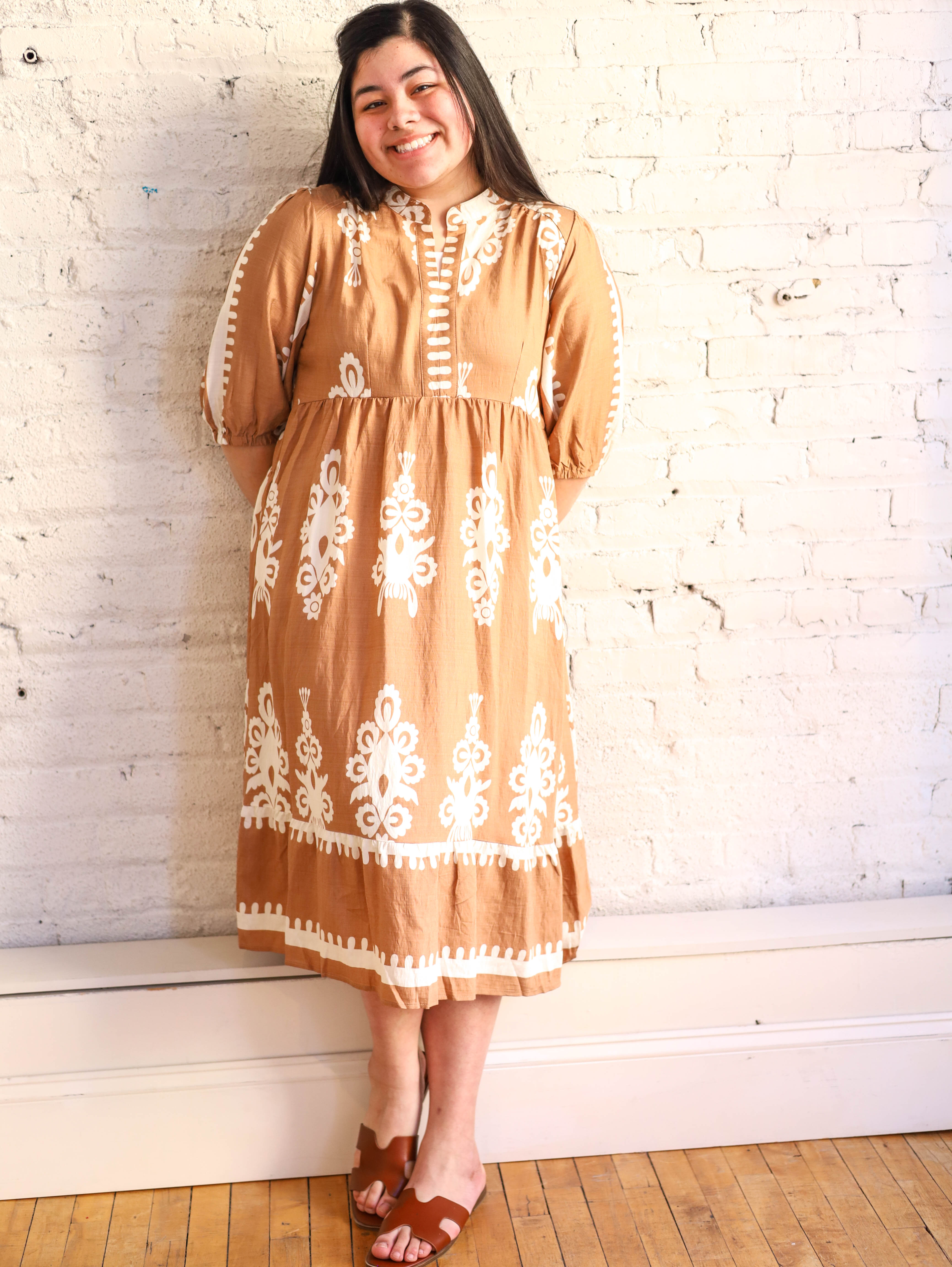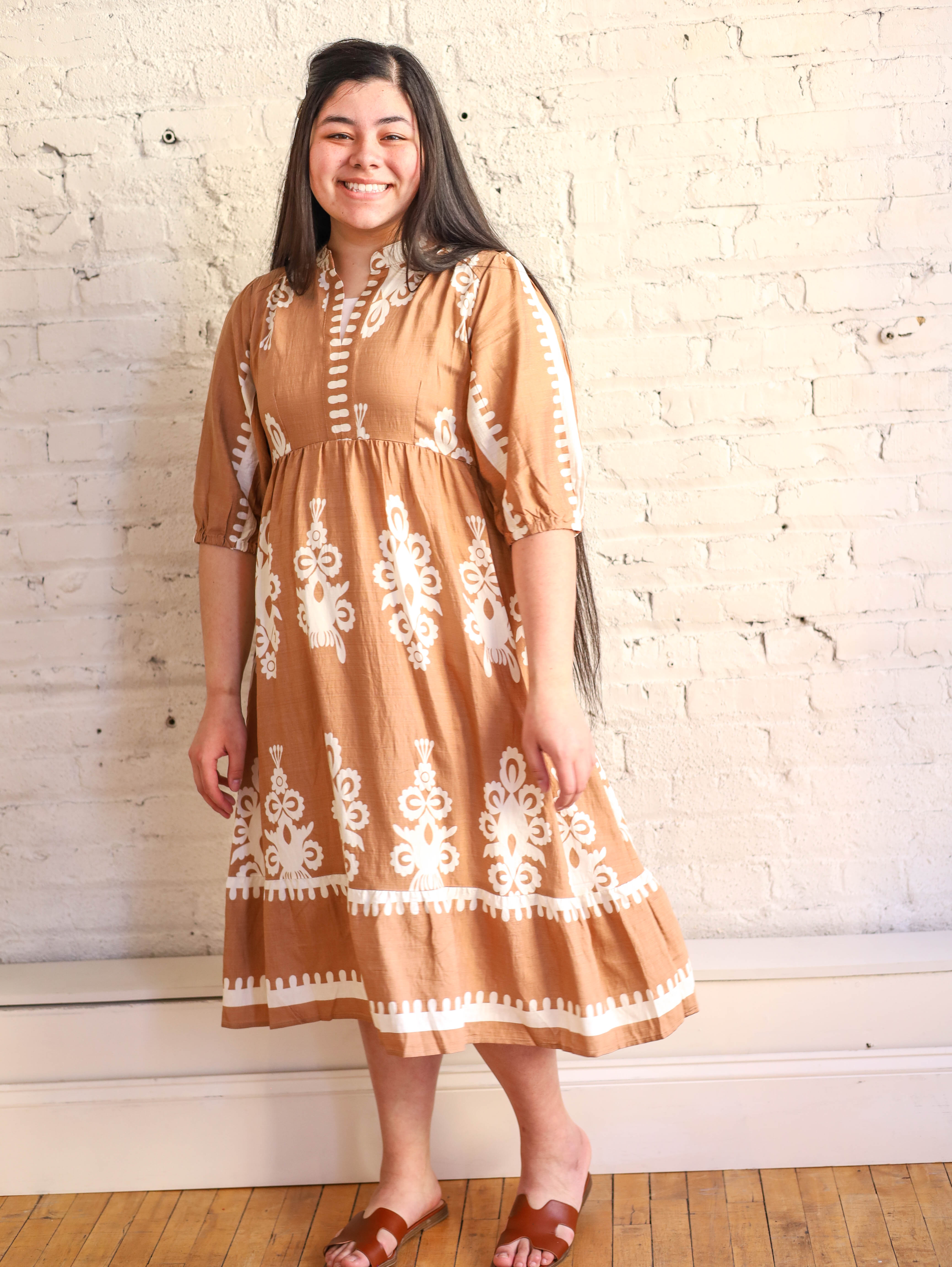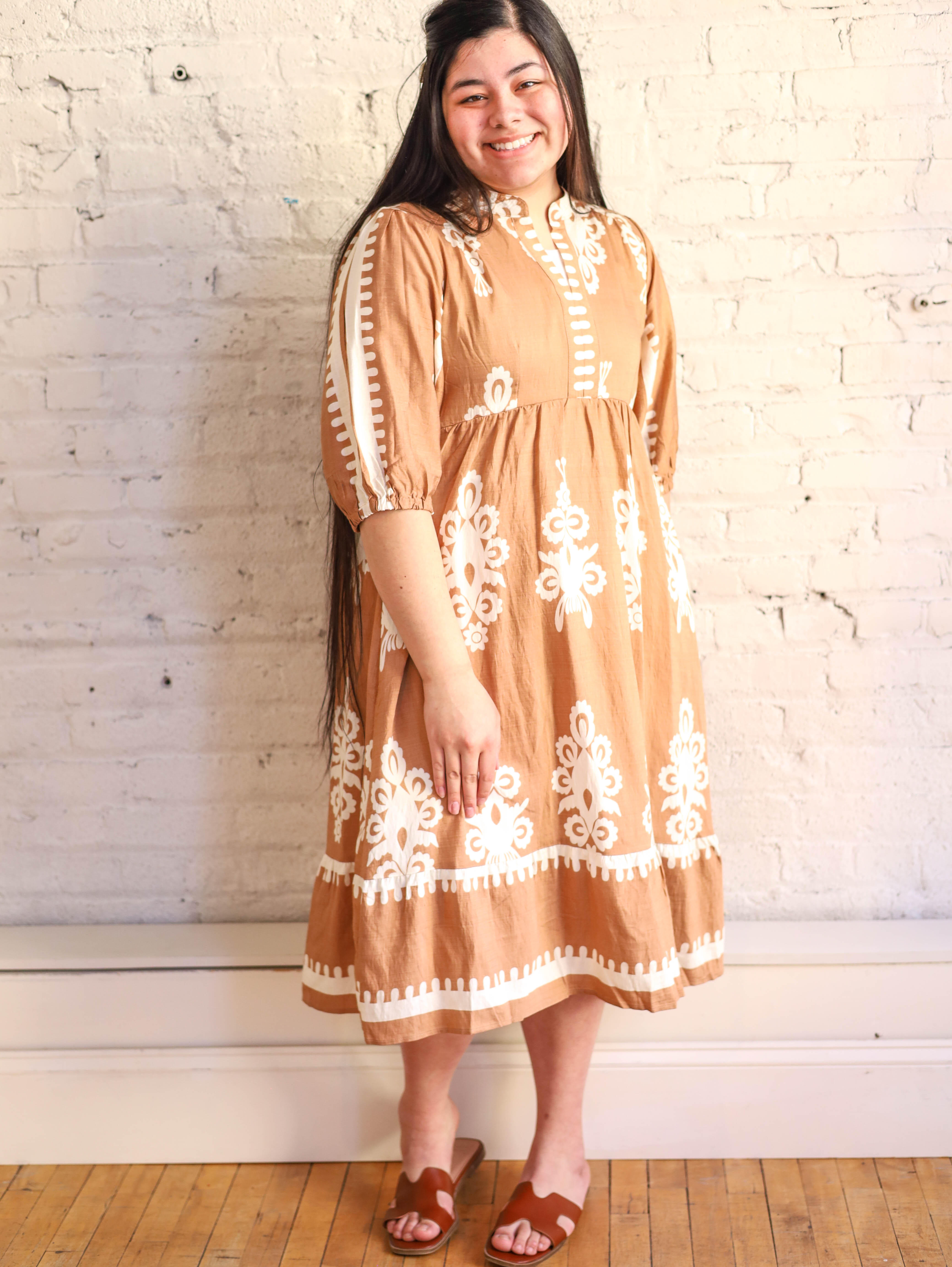 Lovely Neutrals Tan and Cream Midi Dress