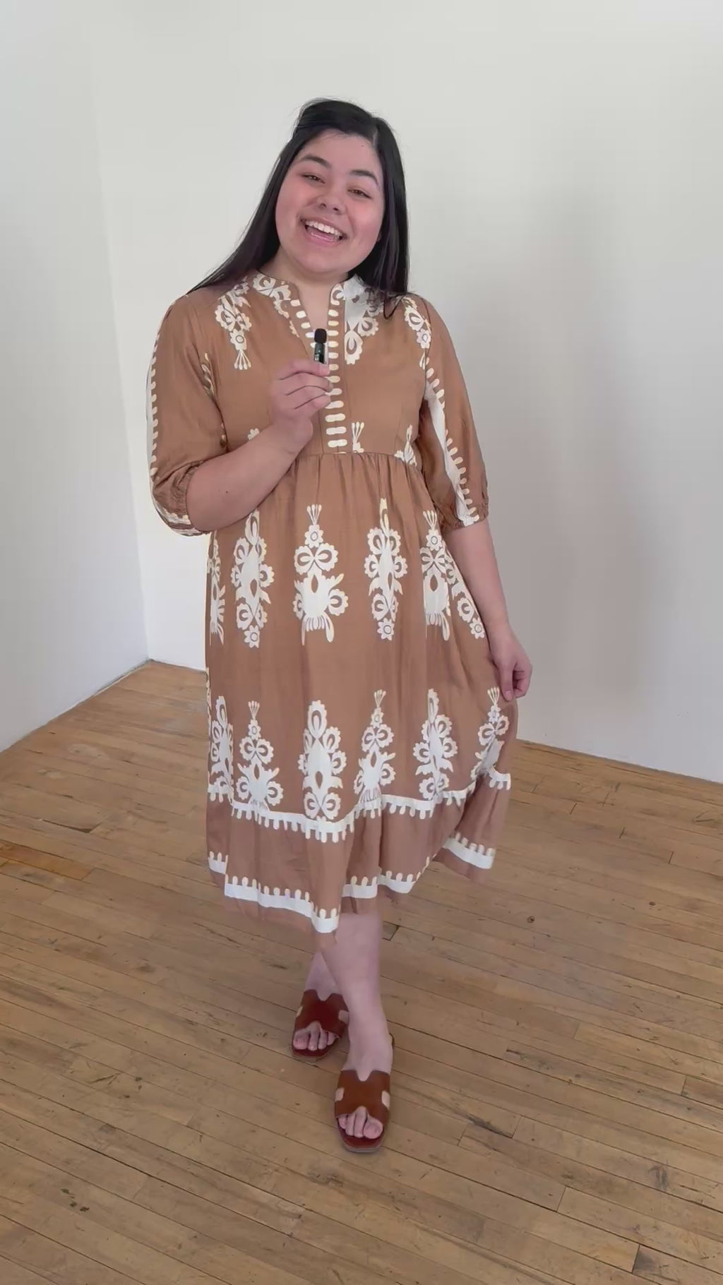 Get ready to stun in our Lovely Neutrals Tan and Cream Midi Dress! With its two tone abstract print and flattering v-neck, this dress is a must-have for any occasion. Add some flair to your wardrobe with this playful, yet elegant piece.