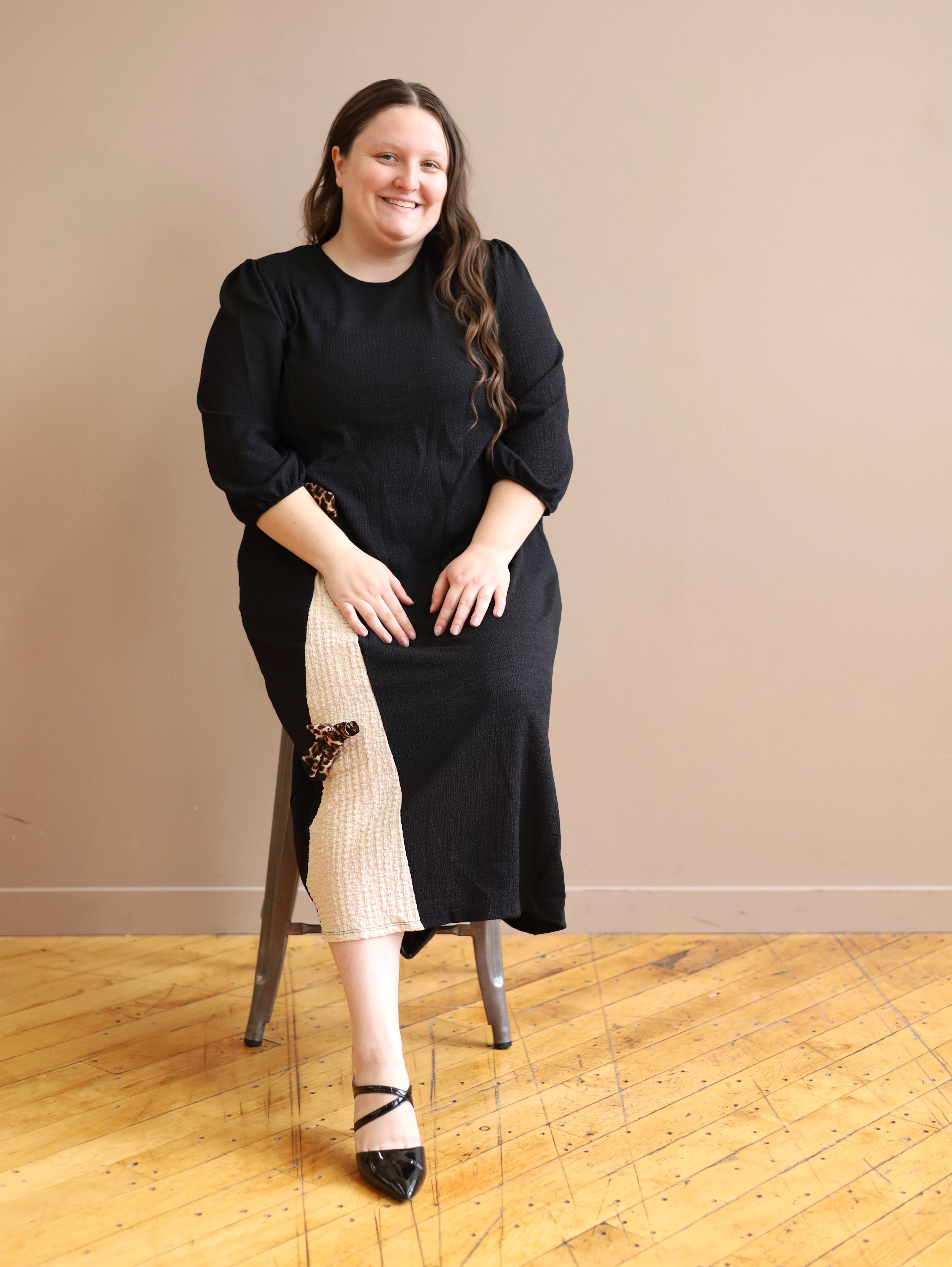 Black and Cream Pleat Dress with Leopard Bows