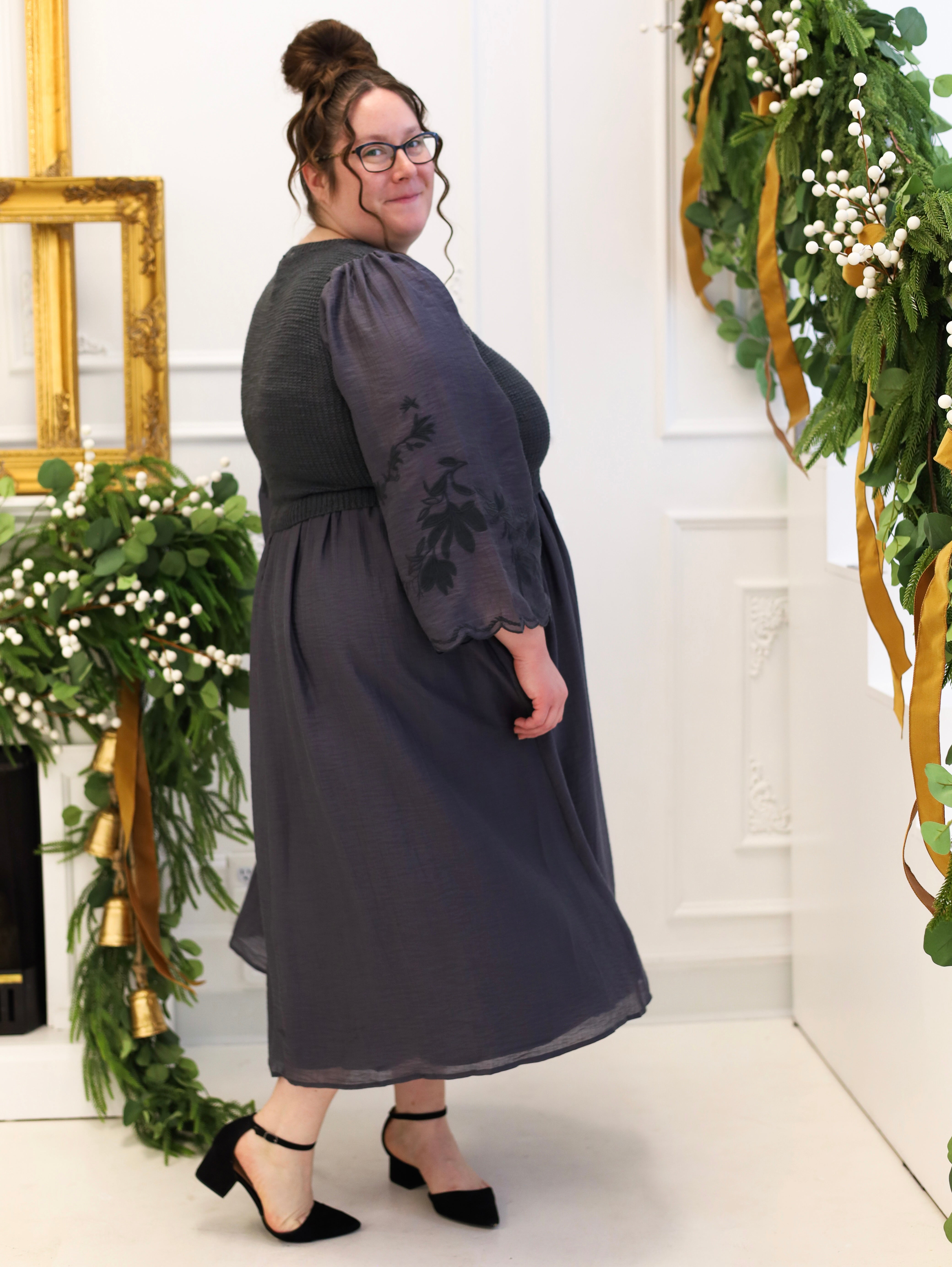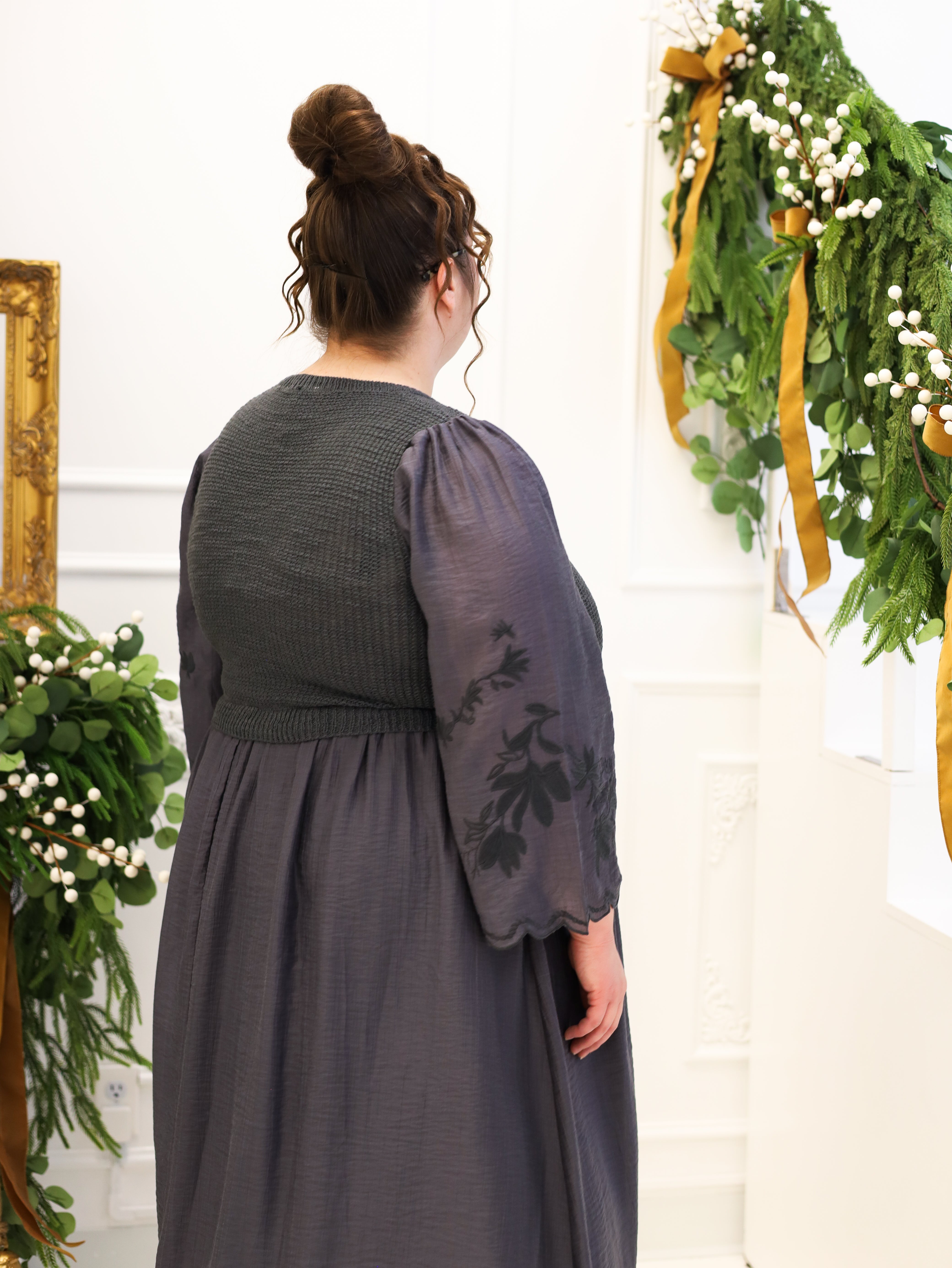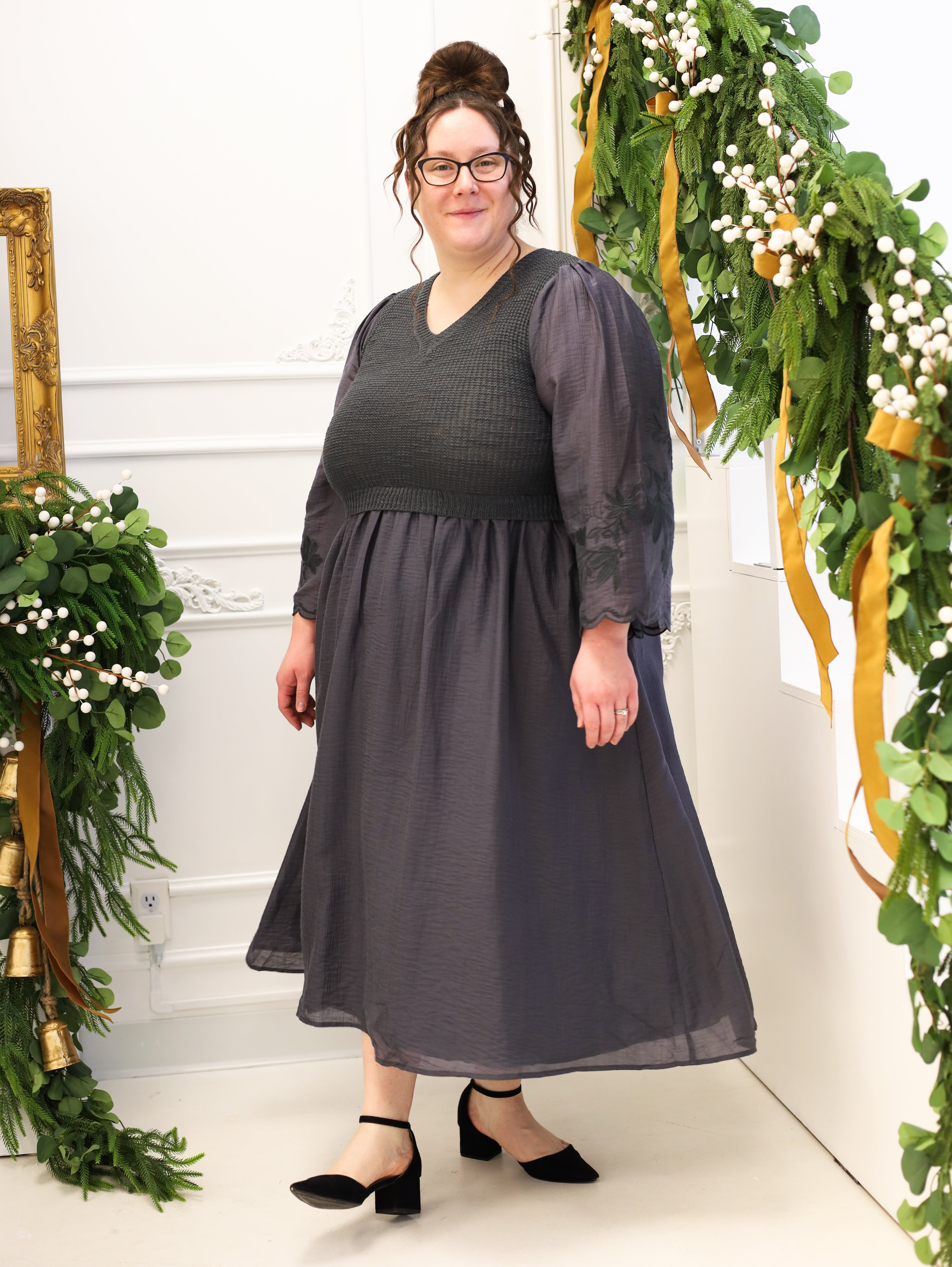 This Charcoal Gray Sweater Dress combines comfort and style with its V-neck silhouette and long sleeves, perfect for cooler days. Crafted from a cozy sweater mix, it features subtle embroidery details and practical pockets, adding both charm and functionality. The midi length delivers an elegant, relaxed fit suitable for various occasions, making it a versatile addition to your wardrobe.