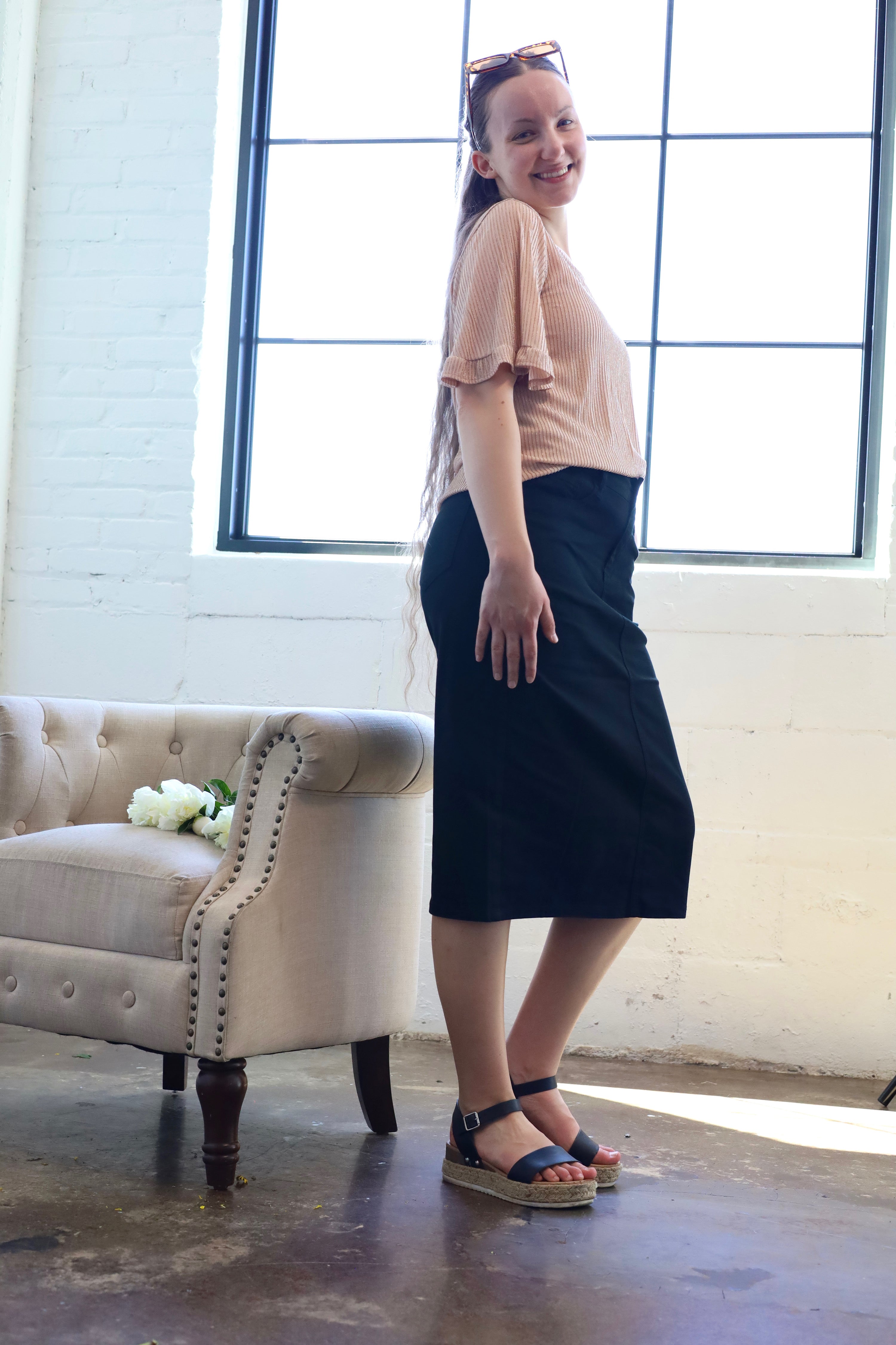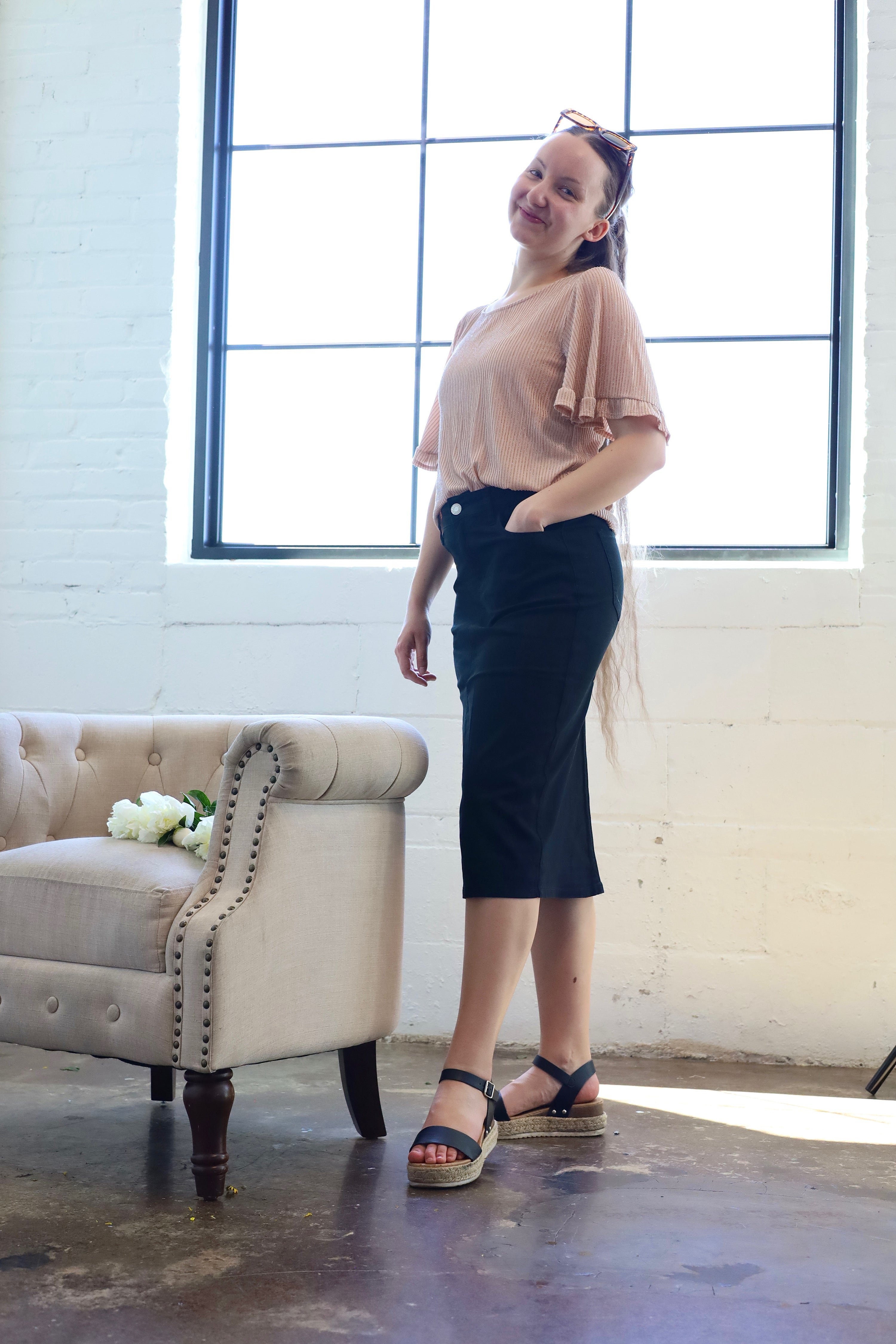 Expertly crafted, this Black Denim Midi Skirt from Be-Girl features a stretch twill fabric for a comfortable and flattering fit. The classic 5-pocket design and pencil silhouette add a touch of sophistication, making it perfect for any occasion, from casual to dressy. With a calf length and no slit, this skirt is a versatile and stylish addition to any wardrobe.