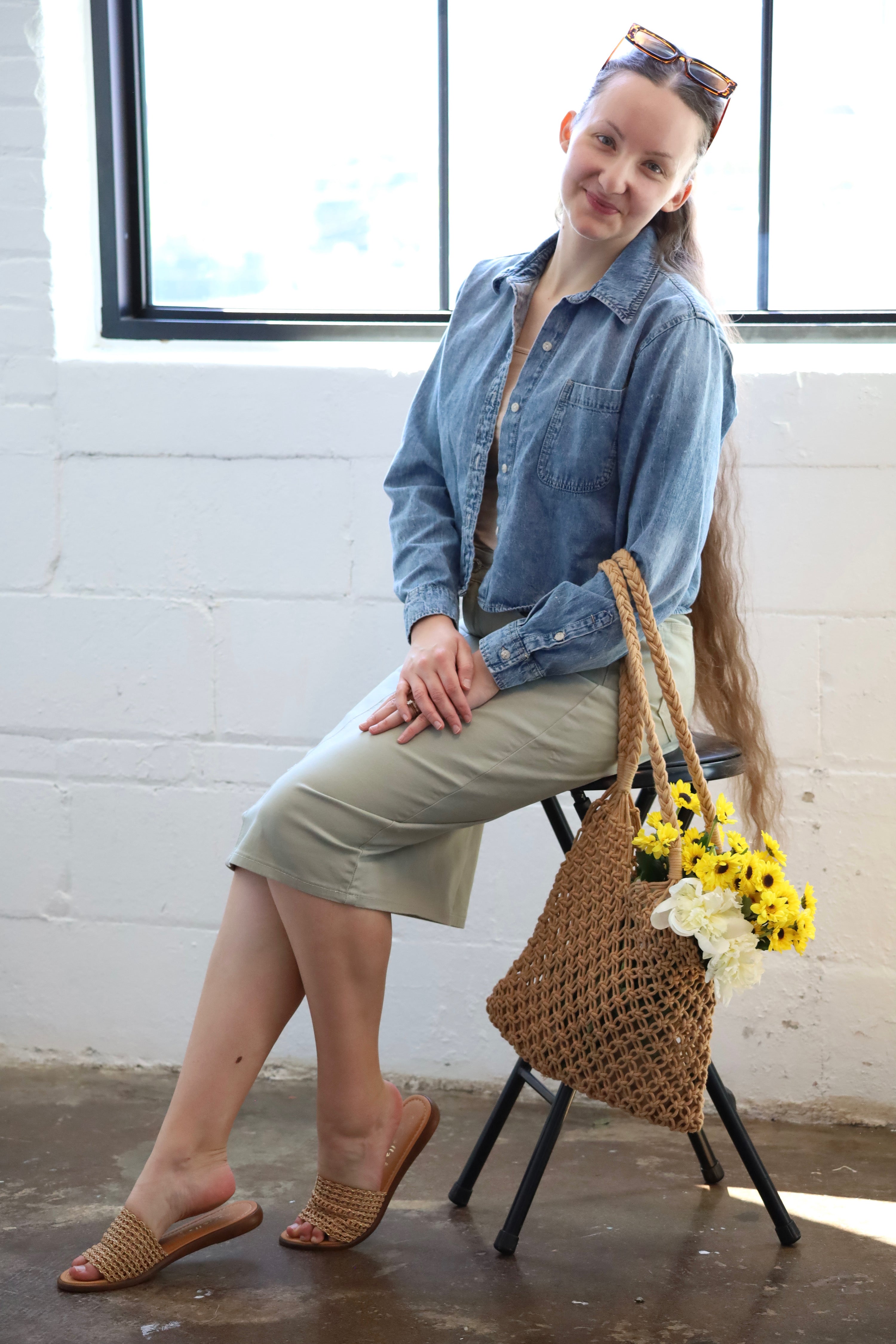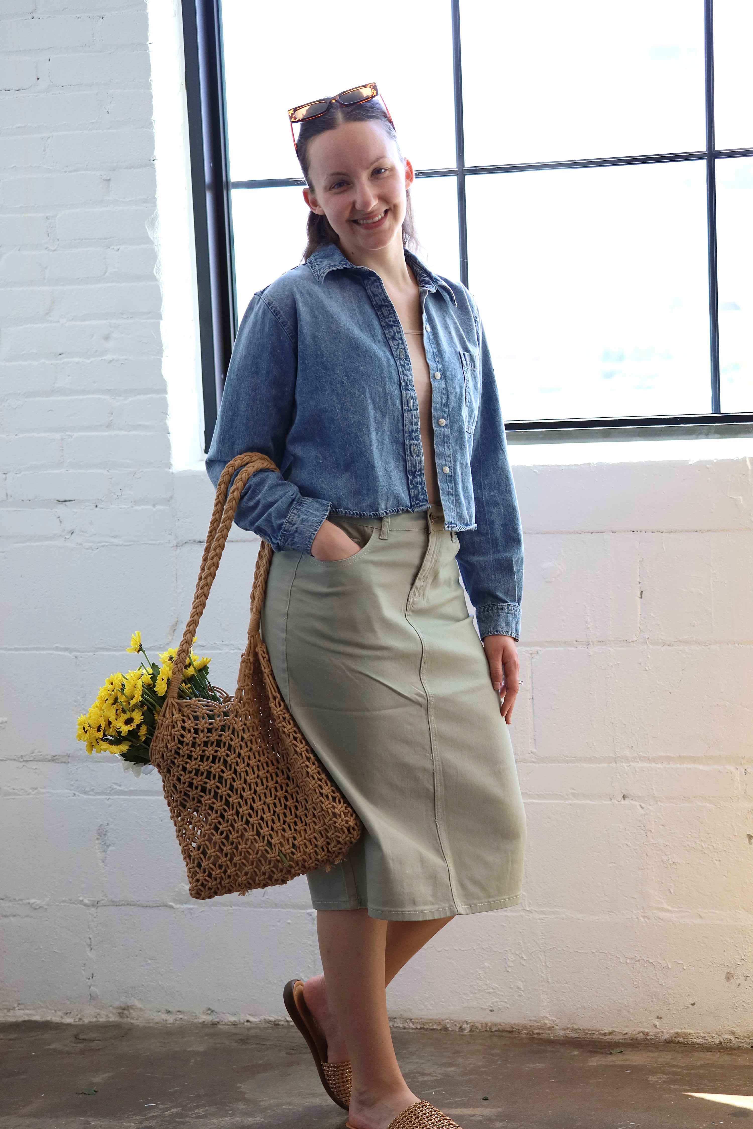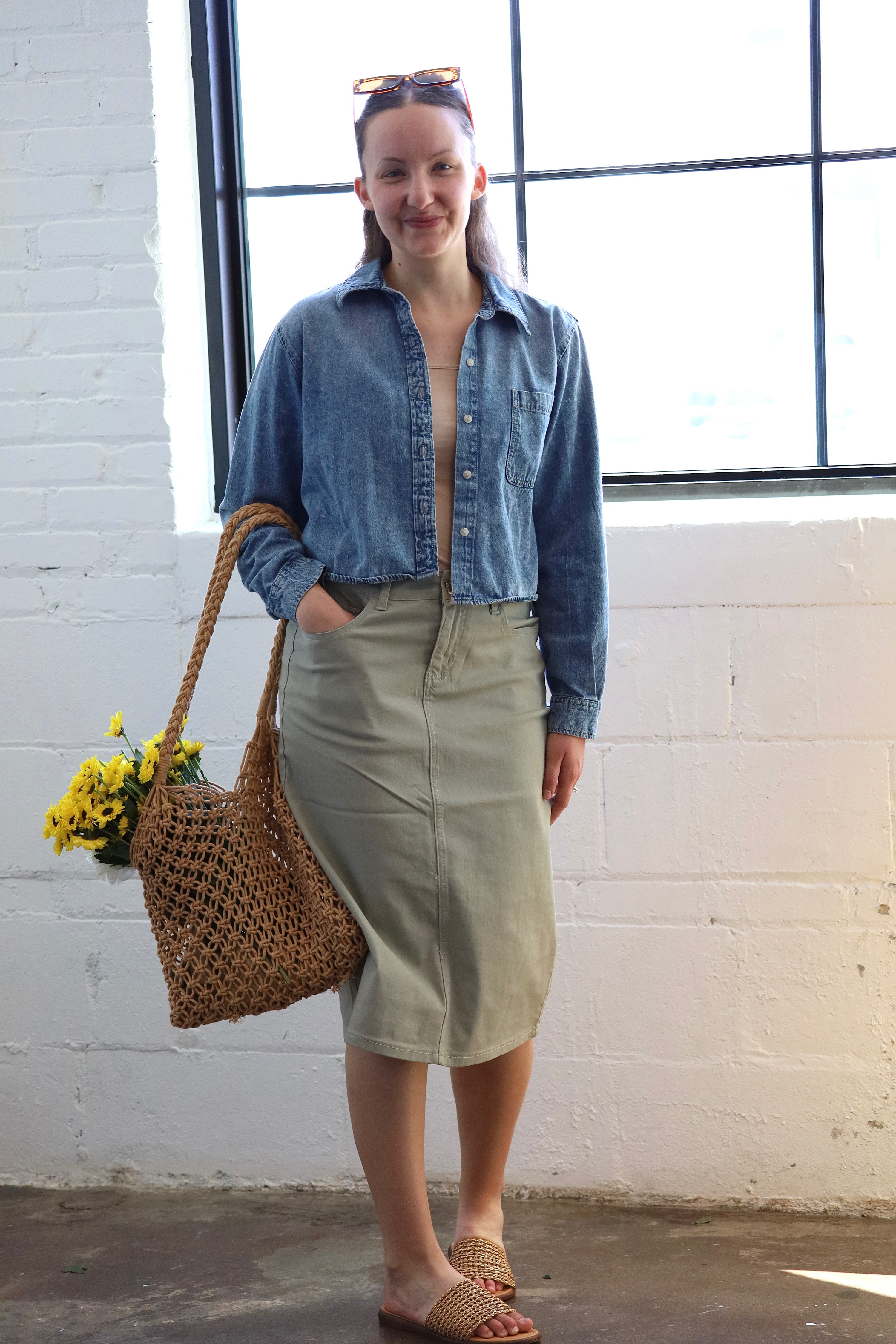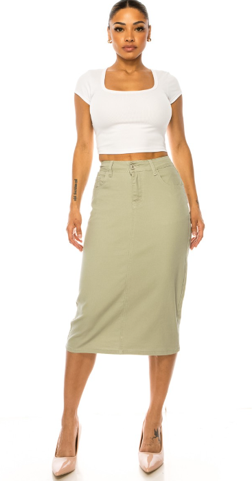 Introducing the Fern Green Denim Midi Skirt - the perfect blend of style and comfort. Made by the Be-Girl band. This skirt features stretch twill fabric, no slit, and is a flattering calf-length pencil skirt length. Enjoy the convenience of 5 pockets while looking effortlessly chic.