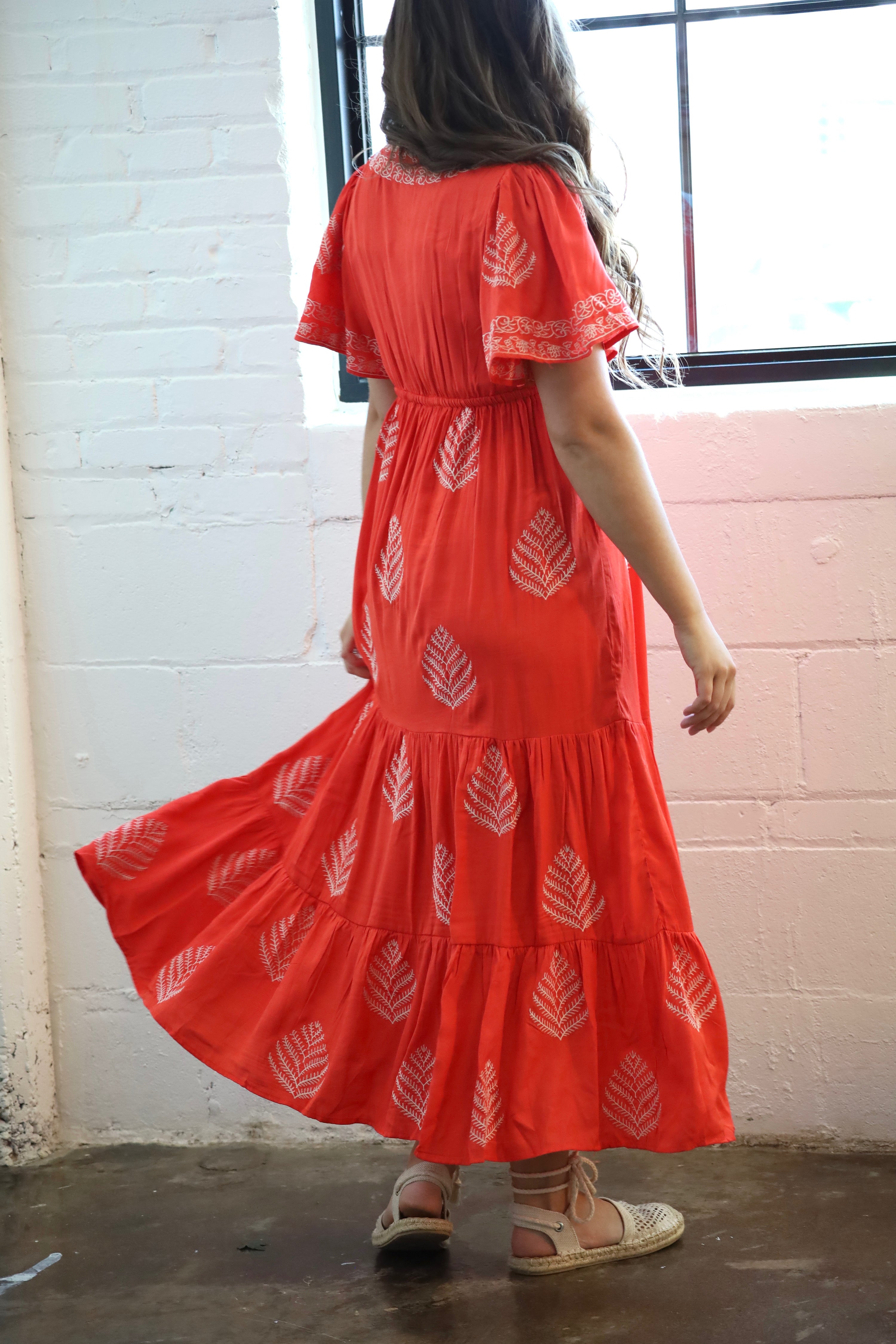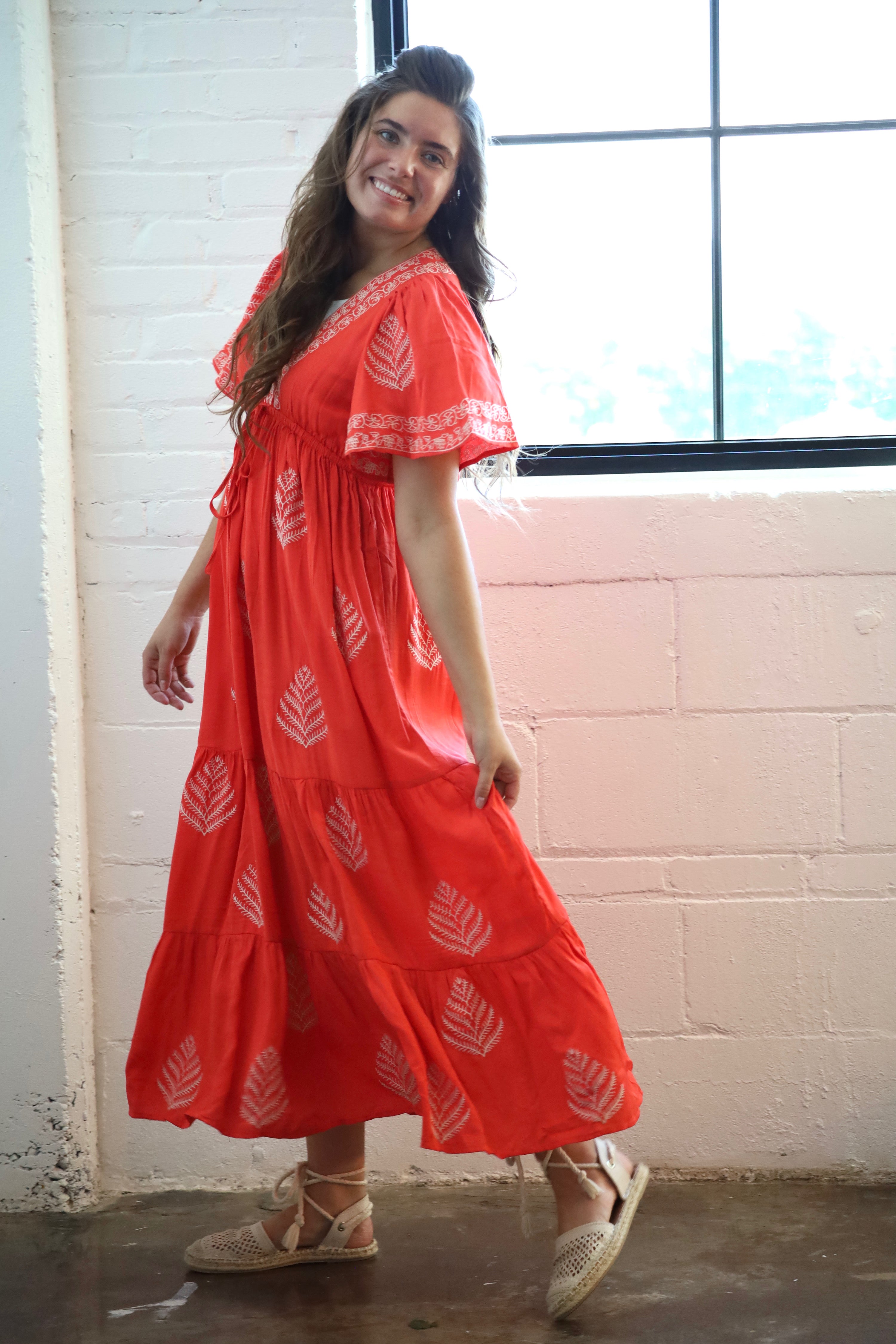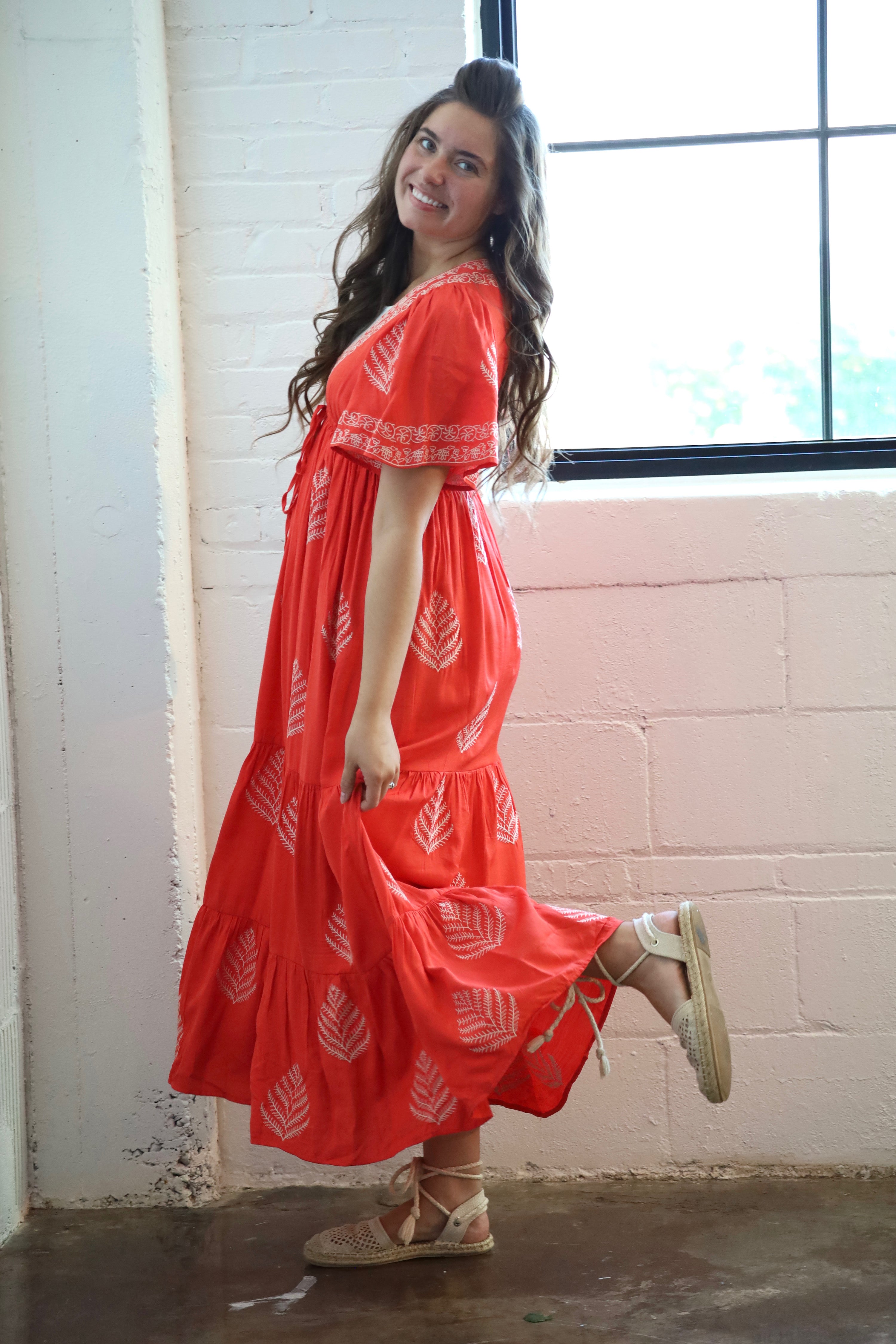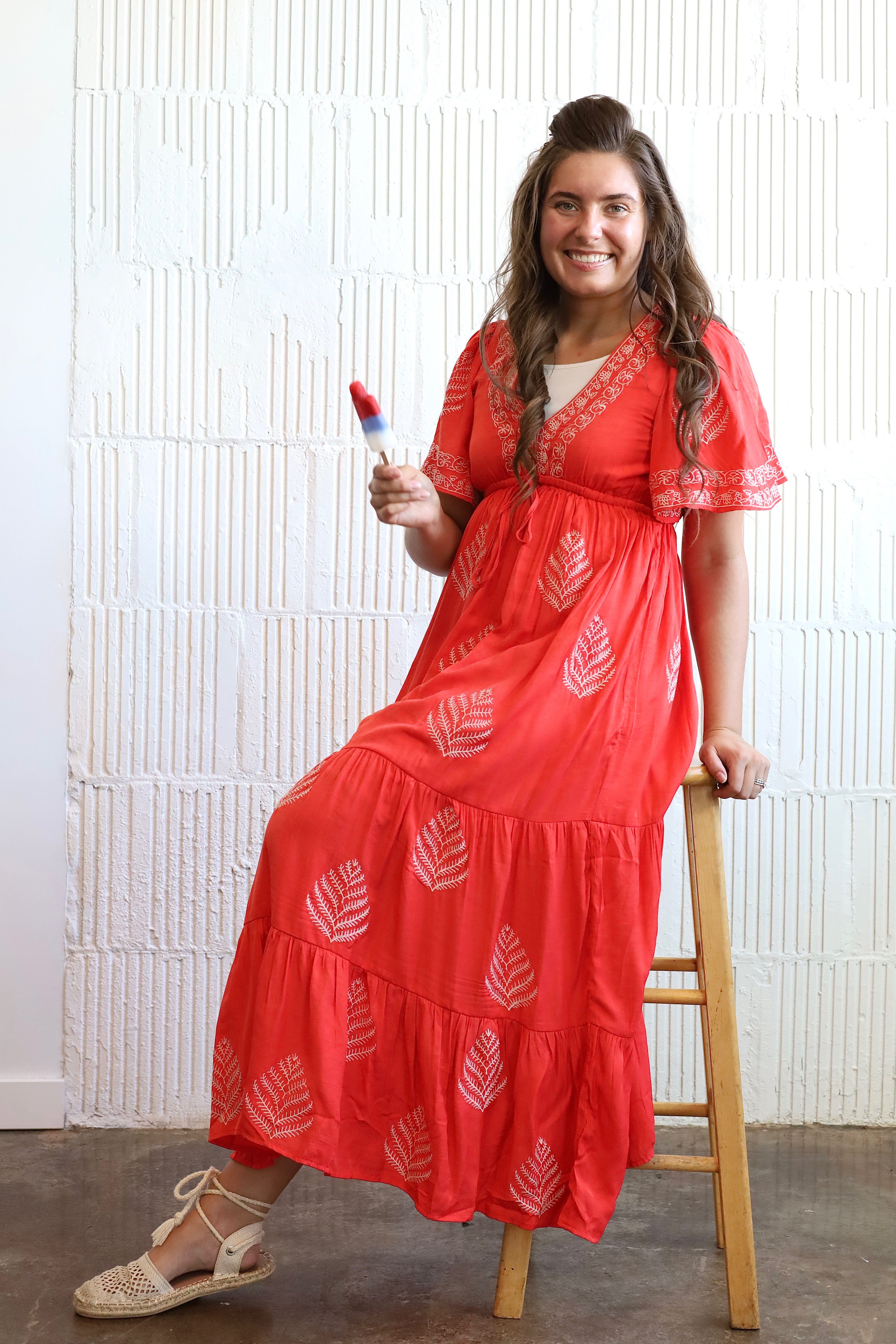 Spice up your summer wardrobe with our Strawberry Red Embroidered Maxi Dress! Flutter sleeves and a tiered flounce hem give a fun touch, while the elastic stretch waistband and tunneled drawstring provide a comfortable fit. With an all-over embroidered motif and lining, this dress is perfect for any occasion.