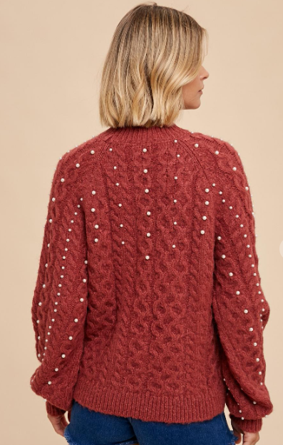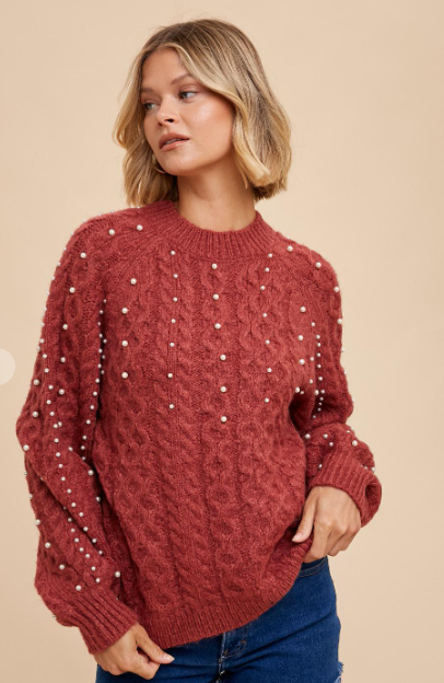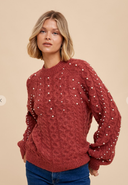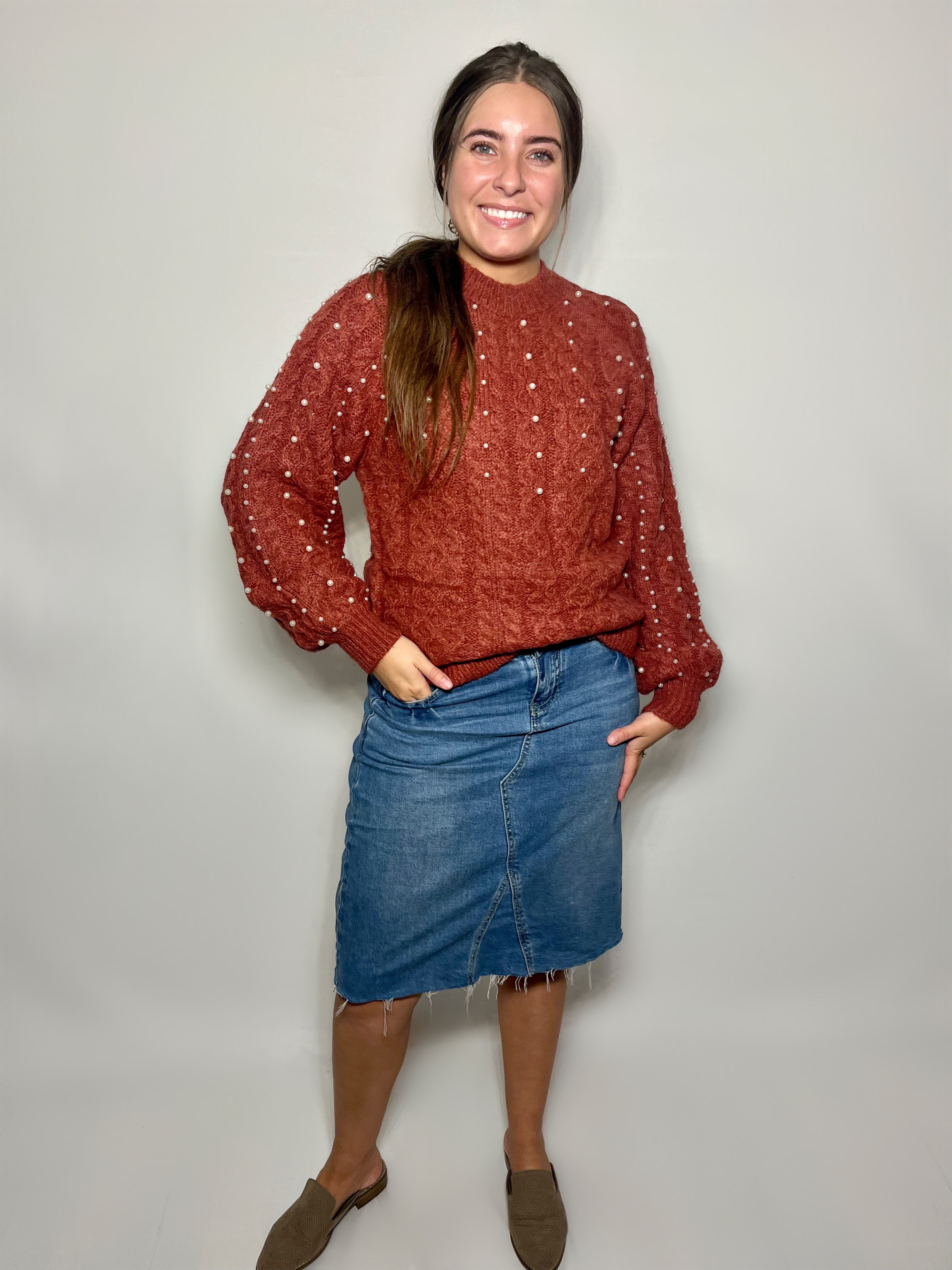 Stay warm and stylish in our Burnt Sienna Pear Detailed Sweater. This fuzzy cable knit sweater features a classic round neck and long sleeves for a comfortable fit. With fun pearl detail, it is the perfect way to add texture and visual interest to your look. This sweater pairs great with one of our denim skirts or our pearl claw clip hair accessories.