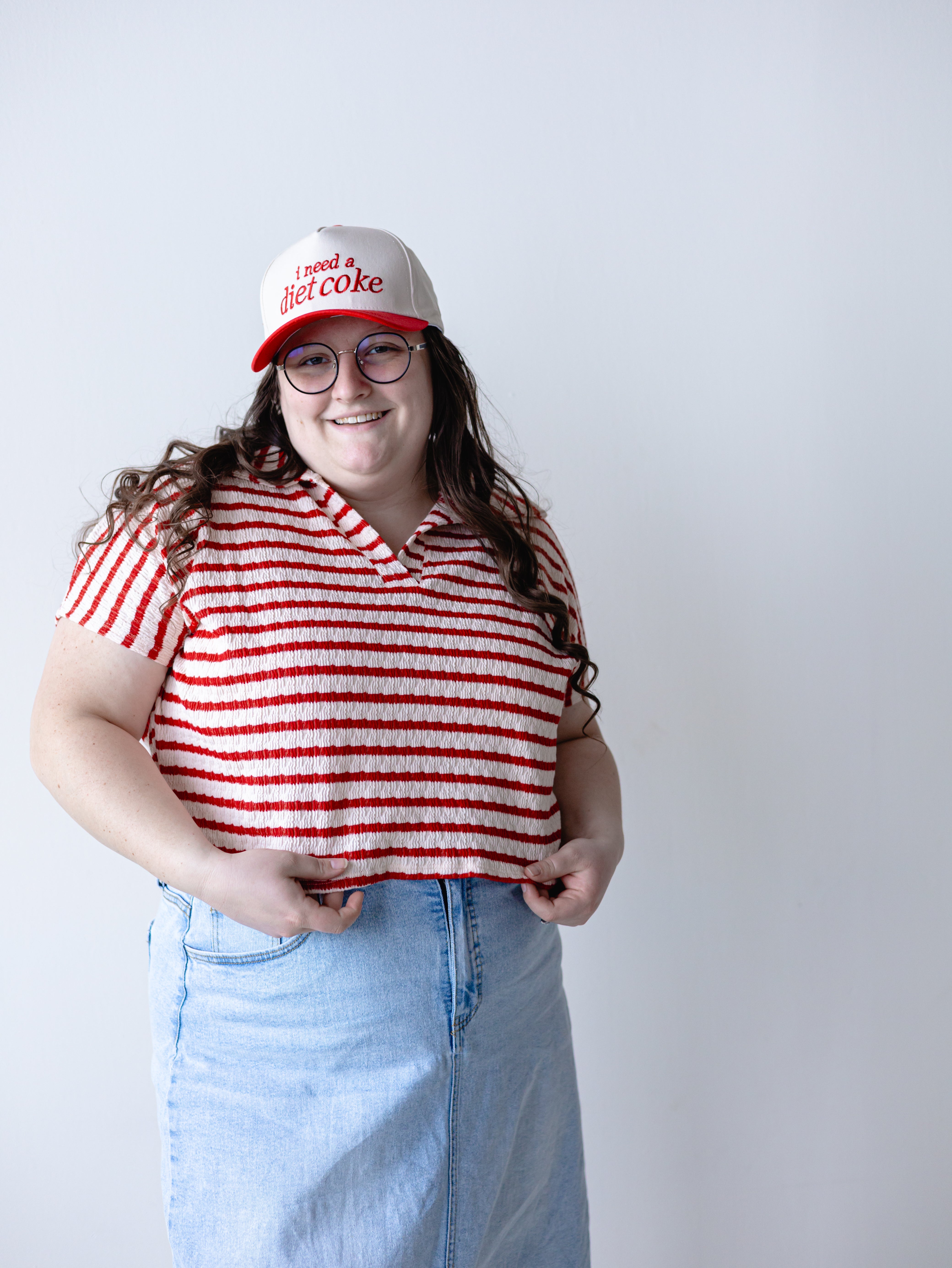 Description: Elevate your casual wardrobe with this striking red and cream striped collared top. The split neckline adds modern sophistication, while the classic stripes deliver timeless appeal. Perfect for layering or wearing solo, this versatile piece transitions seamlessly from weekend outings to relaxed office settings. The structured collar keeps you polished, making it an essential addition to any style-conscious closet.