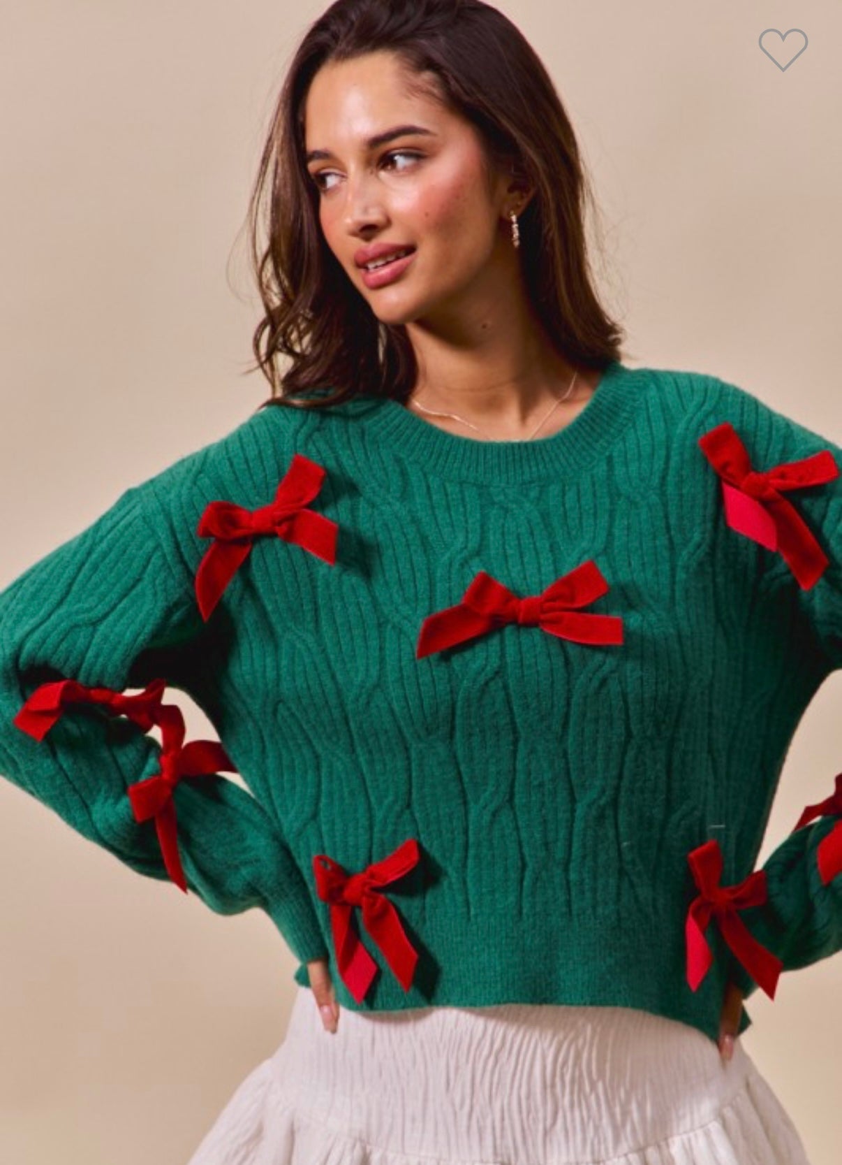 Cozy up in this charming cable knit sweater featuring an adorable velvet bow appliqué that adds instant personality to your wardrobe. The soft, textured knit keeps you warm while the playful ribbon embellishment brings a touch of whimsy to casual outfits. Perfect for layering over your favorite dresses or styling solo for effortless, put-together looks. A sweet staple that transitions beautifully from season to season.