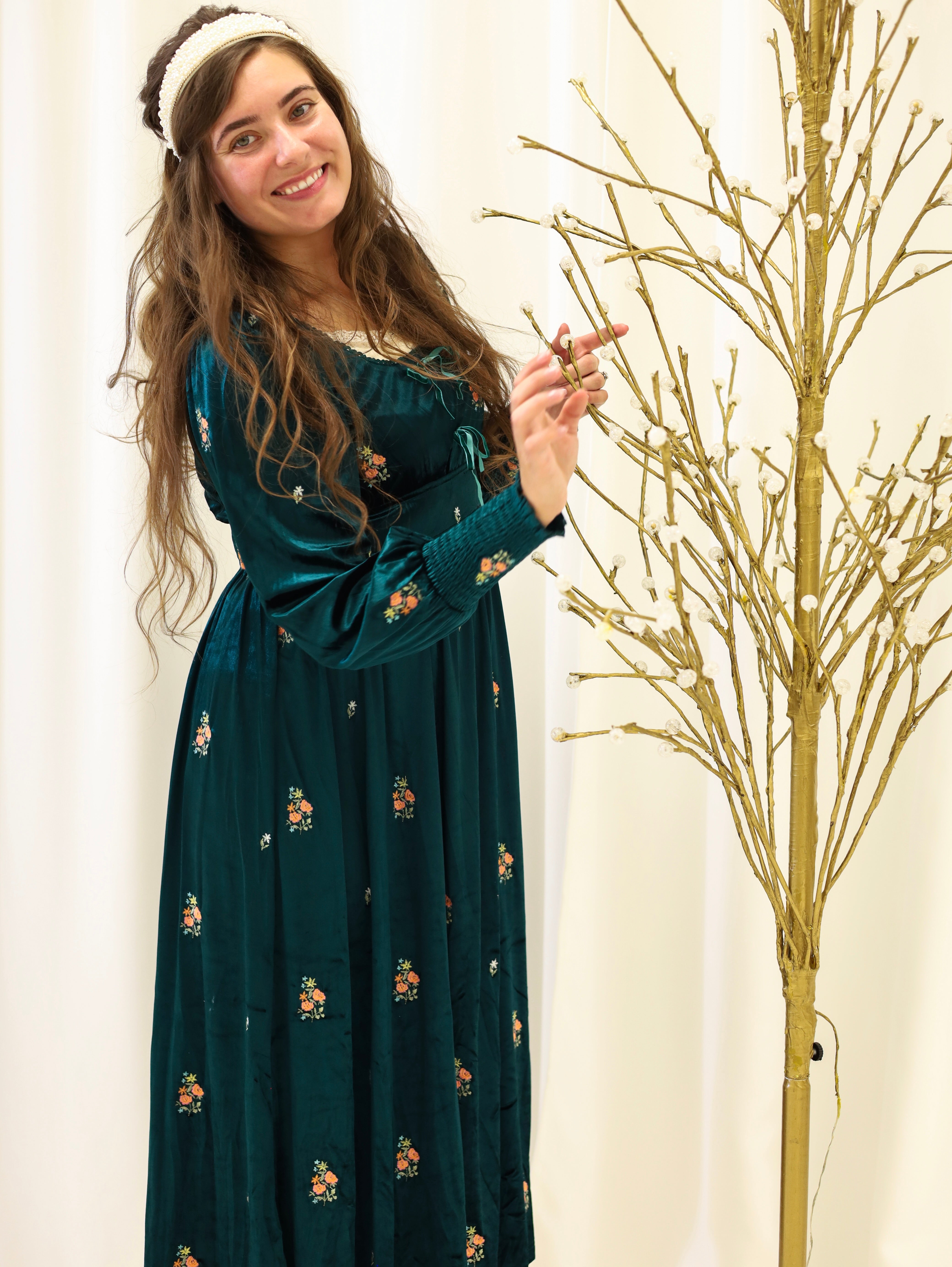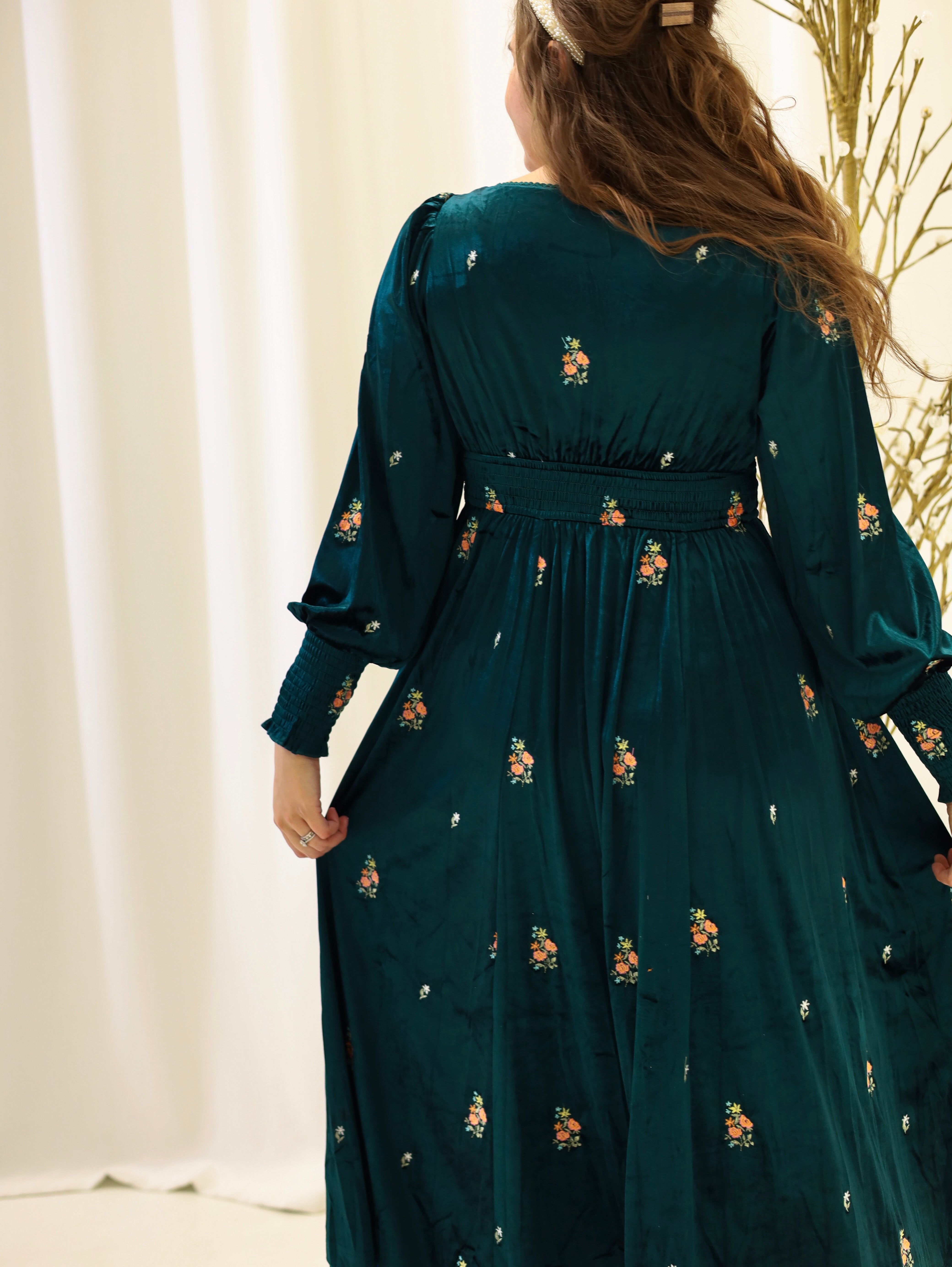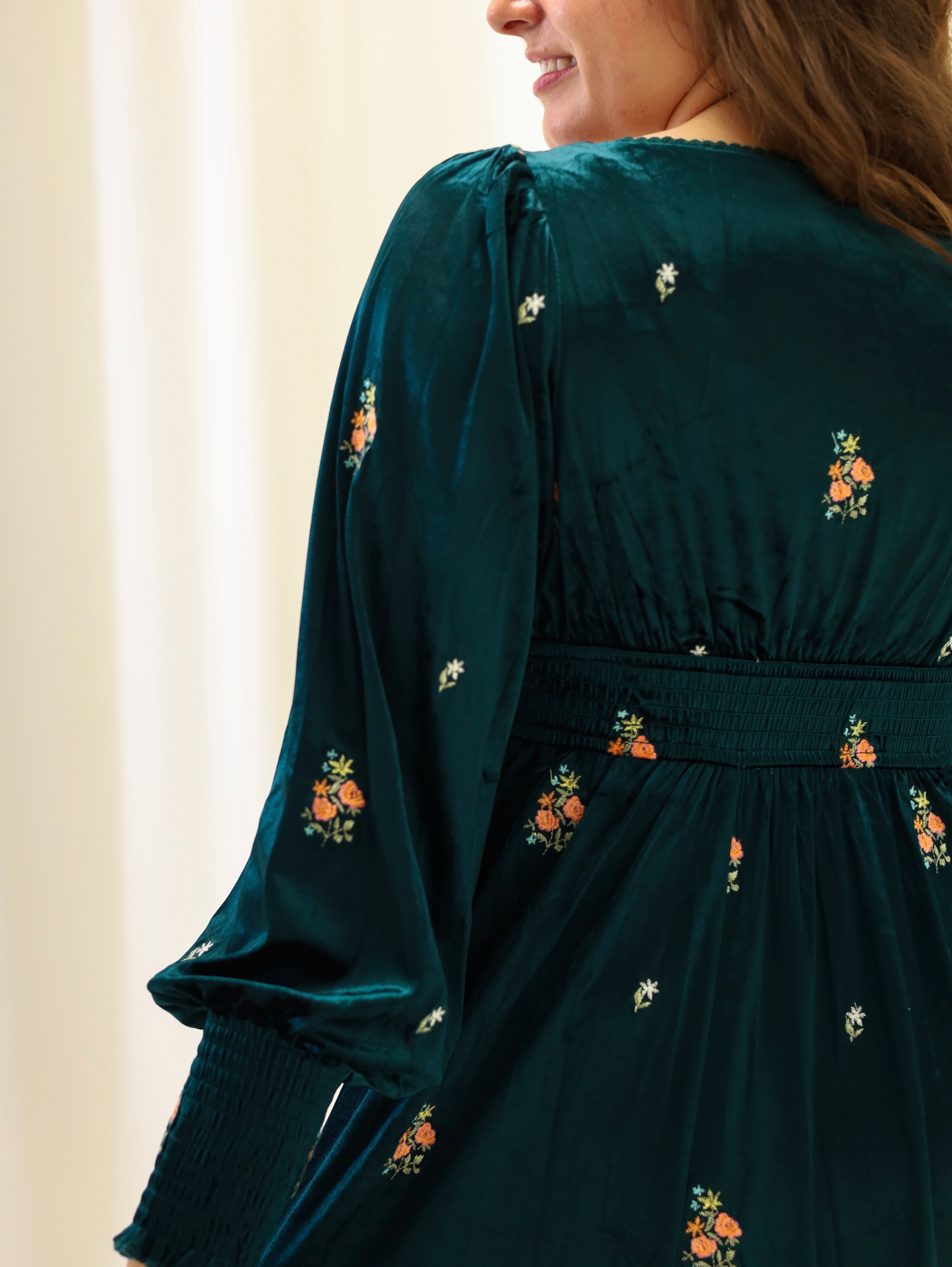 Twirl into elegance with this enchanting emerald velvet midi dress! Luxurious velvet fabric drapes beautifully while delicate floral embroidery dances across the entire silhouette. The scoop neckline features charming scalloped lace trim, and smocked details at the sleeve ends and back waist add vintage-inspired flair. Adorable velvet bow tie accents provide the perfect finishing touch, while a concealed side zipper ensures a seamless fit. Perfect for special occasions or whenever you want to feel absolutely magical.
