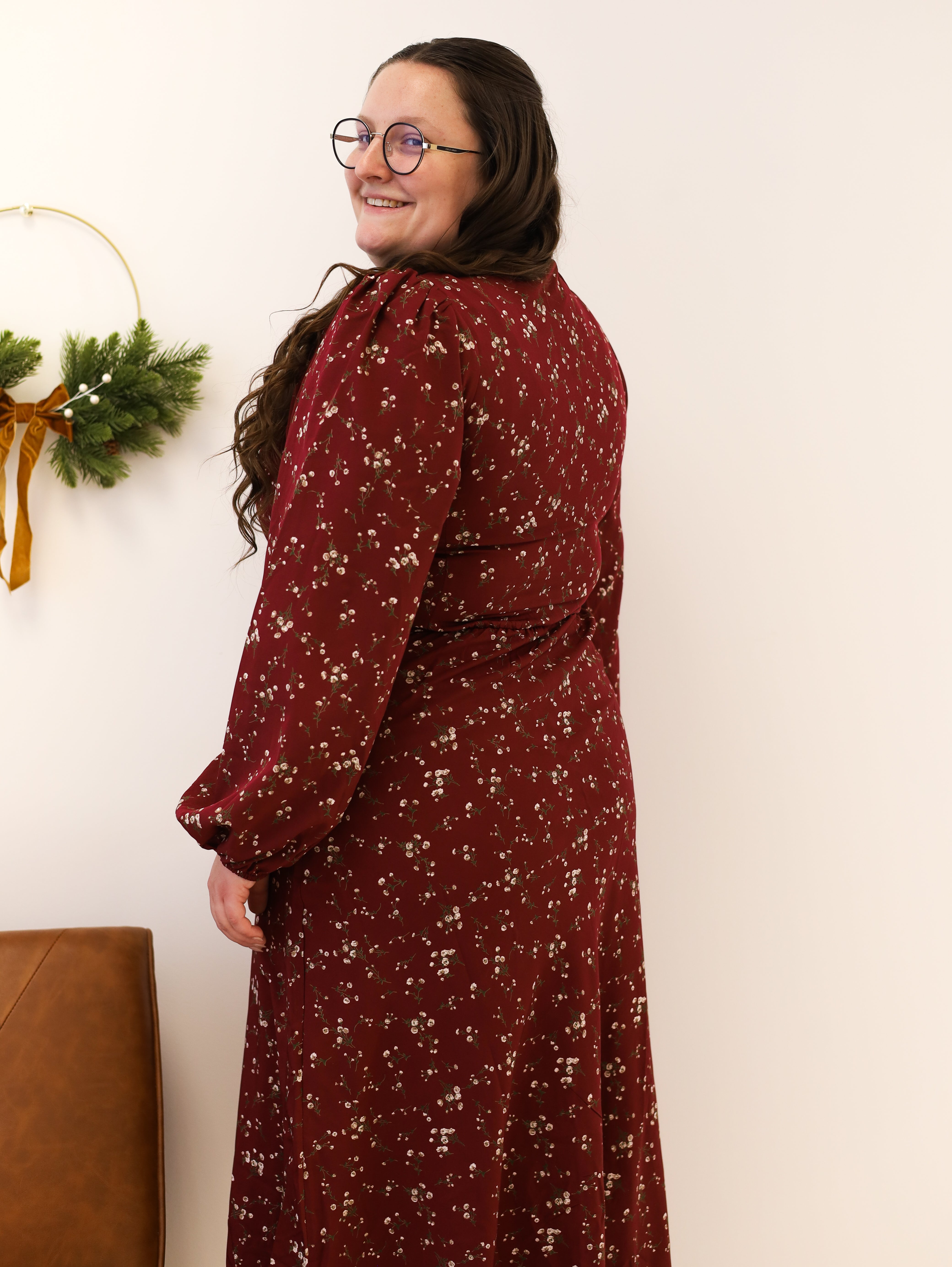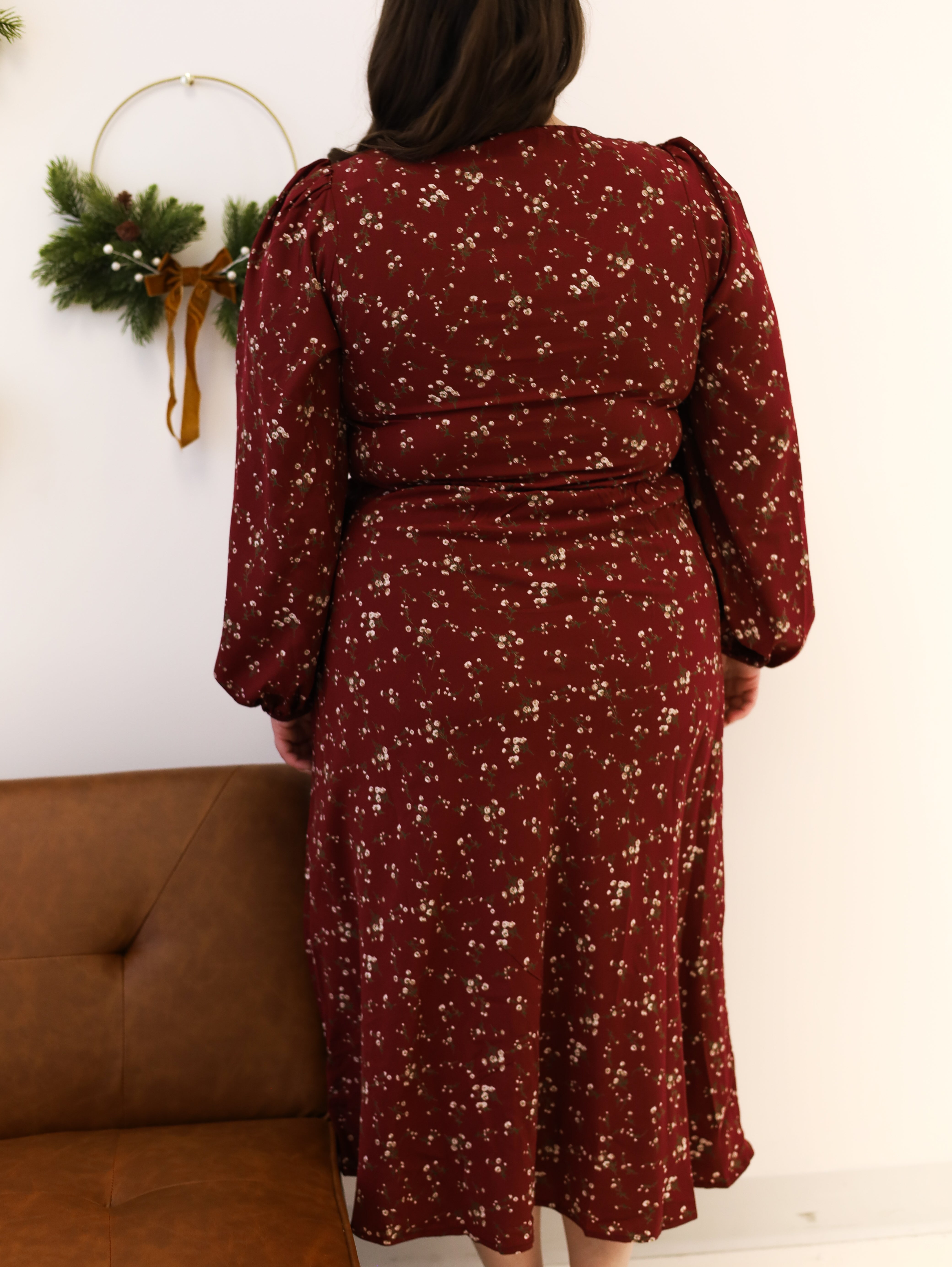 This Cranberry Punch Floral Satin Dress blends charm with comfort. Featuring a playful V-neck trimmed with delicate lace and front buttons for an easy, stylish look. Elastic sleeve cuffs add a touch of whimsy, while side pockets and a discreet zipper keep it practical. The floral print and midi length make it perfect for dancing through any day or night in effortless style.