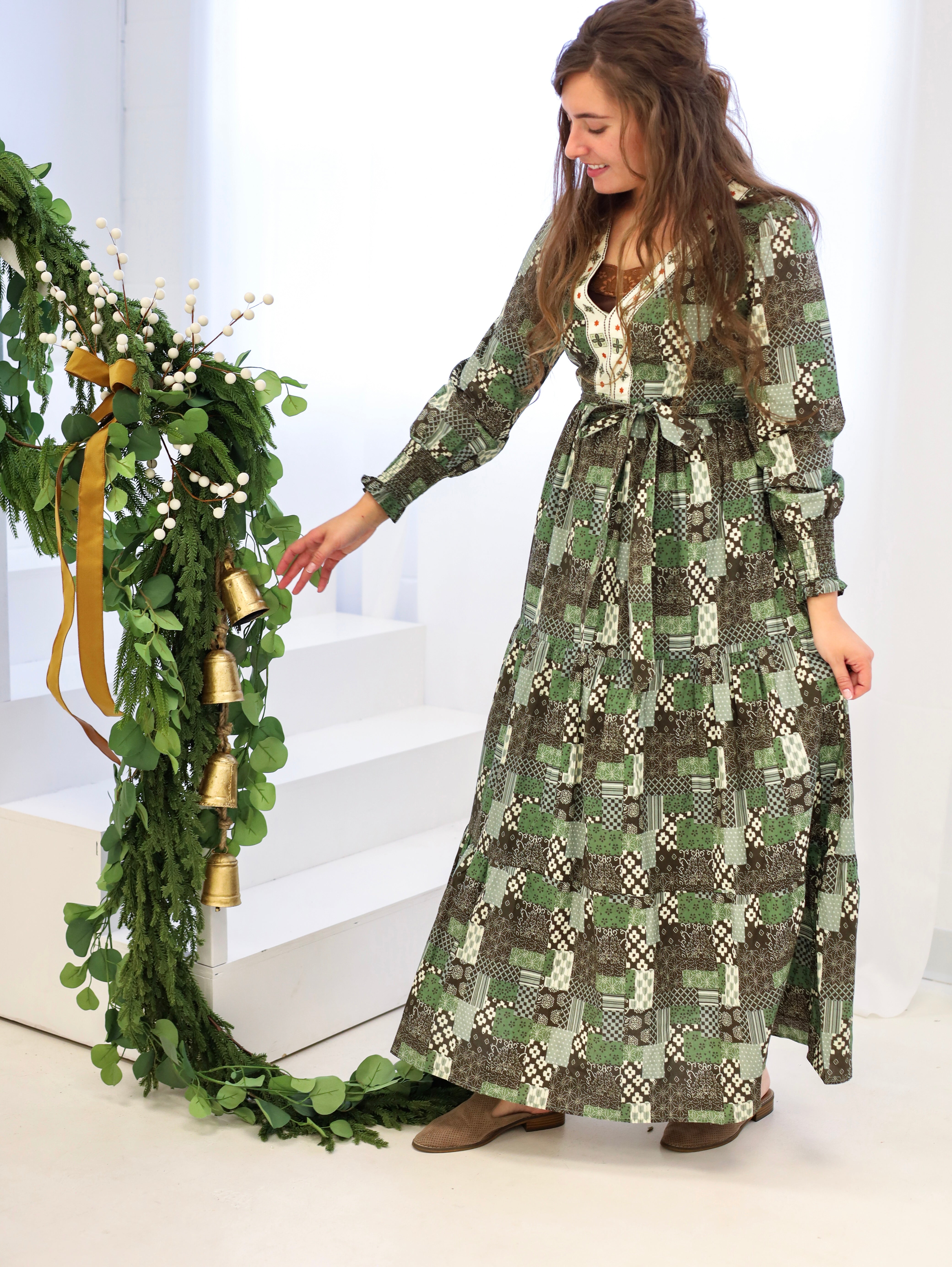 Embrace bohemian elegance in this patchwork maxi dress, crafted from soft cotton for all-day comfort. The embroidered V-neckline features contrasting trim, while long puff sleeves with smocked cuffs add vintage charm. A removable self-tie waist belt defines your silhouette, and the tiered skirt creates beautiful movement with every step. Practical hidden side pockets keep essentials close, while the lined construction ensures a polished look. The relaxed, flowy design flatters all figures, making this versatile piece perfect for seasonal celebrations or everyday style.
